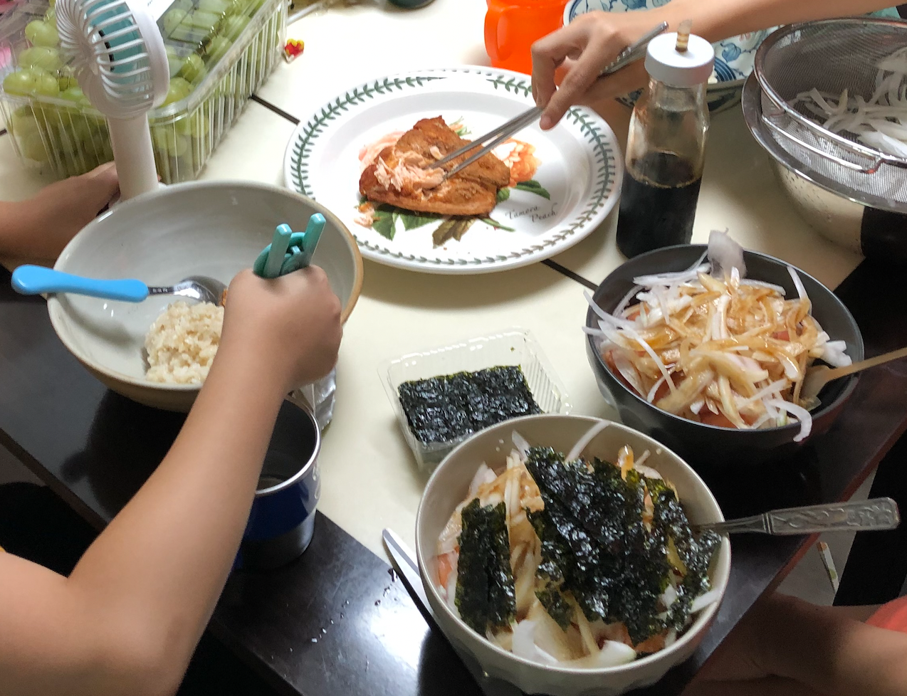 사케동 두 그릇에 꼬리 부분은 굵은소금이 묻어 있는 상태로 구웠습니다. 아이들이 연어스테이크를 좋아해서 종종 이렇게 구워주곤 합니다. 조금 남겨 두었다가 한 번 더 구워주었고요.