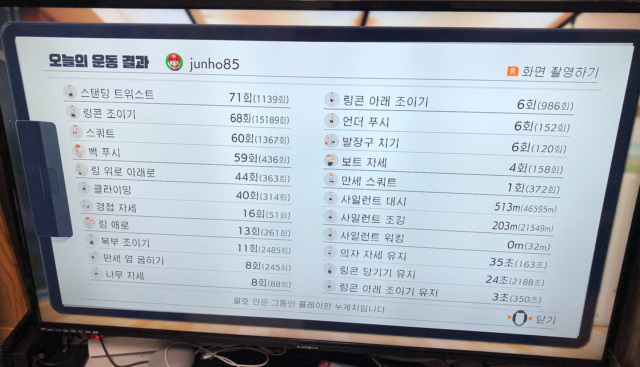 구입하고부터 꾸준히 해서 지금은 40일 이상 매일매일 링 피트로 운동을 하고 있습니다.