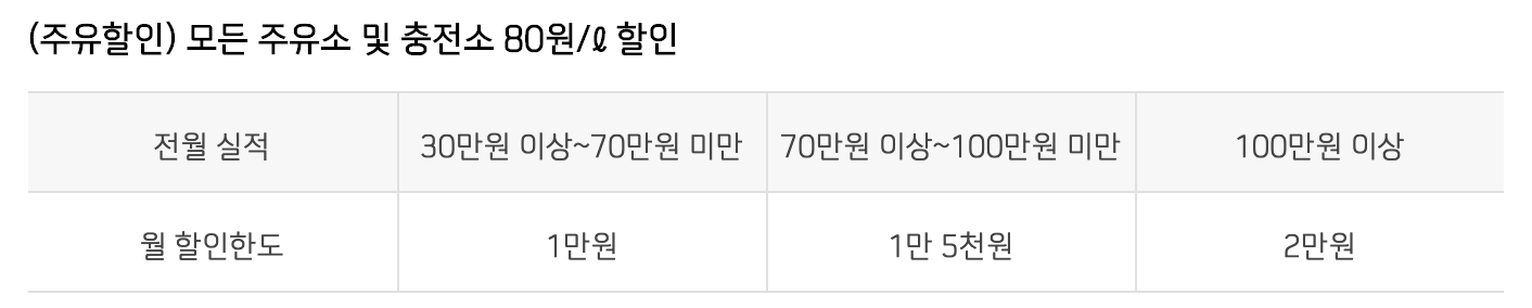 전월 실적이 일단 30만 원은 넘어야 되는데요. 매달 주유를 10만 원 내외로 했었기 때문에 할인받기는 어려울 거 같네요. 이전에는 추가 할인을 받기 위해 일부러 GS칼텍스에 가곤 했는데 앞으로는 아무 주유소나 가면 되겠습니다.