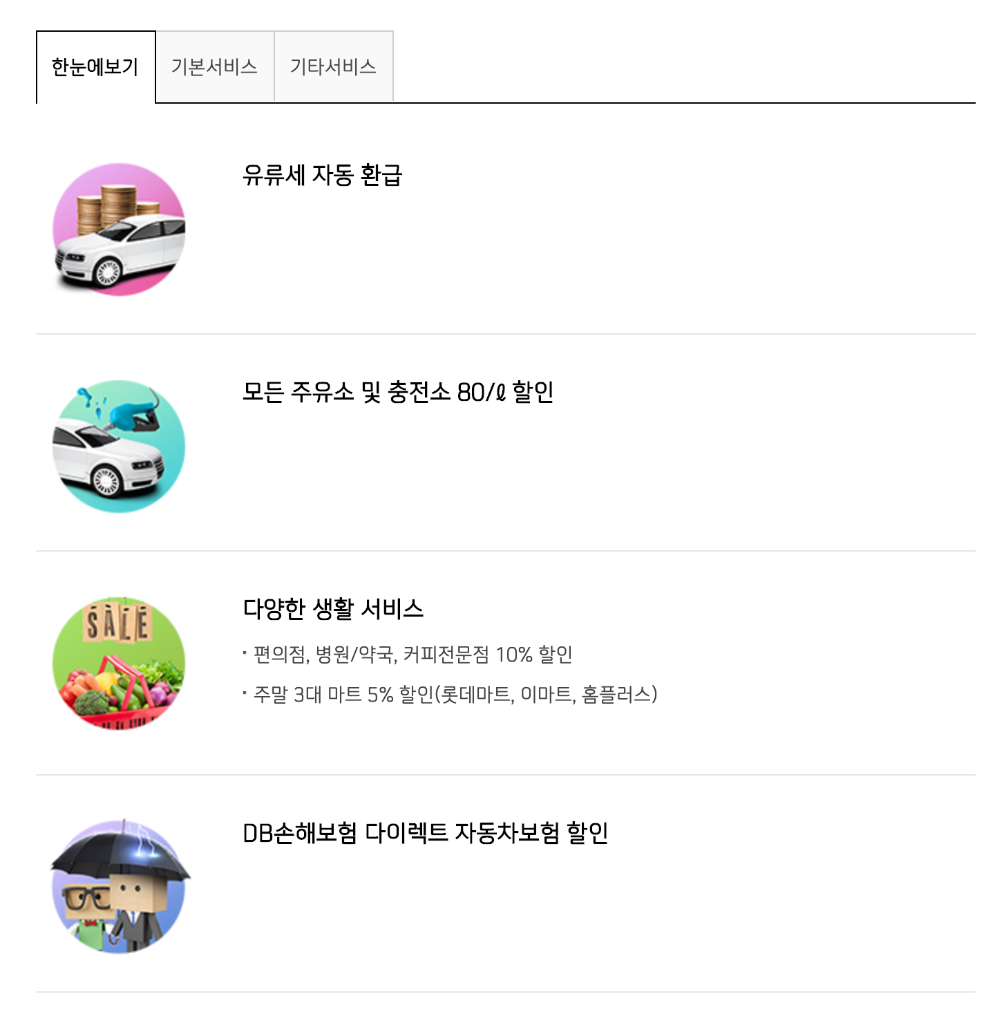 한눈에보기 모든 주유소 및 충전소 80/ℓ 할인 다양한 생활 서비스 편의점, 병원/약국, 커피전문점 10% 할인 주말 3대 마트 5% 할인(롯데마트, 이마트, 홈플러스) DB손해보험 다이렉트 자동차보험 할