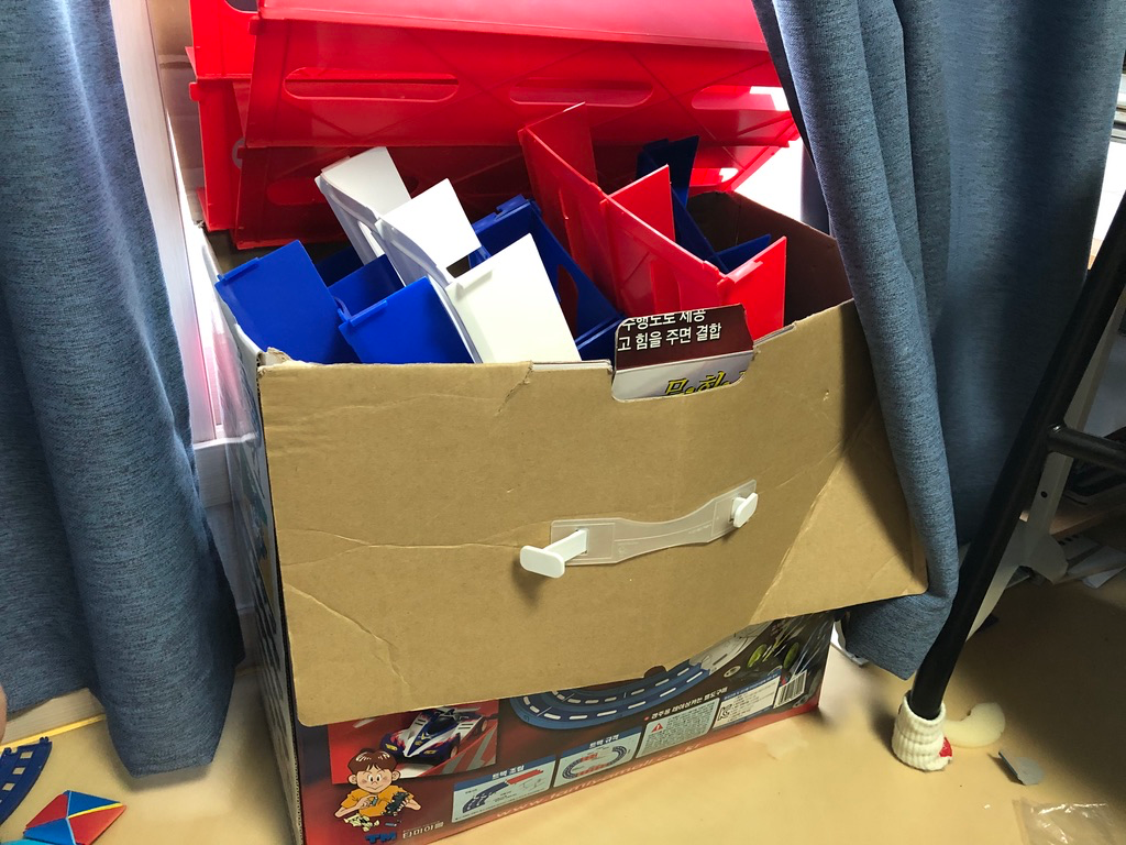 그리고 결정적으로 아이들 방에 책상을 주문했기 때문인데요. 아이들 공부방이라고 하기에는 가지고 놀지 않는 장난감들이 너무나 많이 쌓여 있었습니다. 이번에 쇼핑백 큰 사이즈로 3개 이상 버린 거 같고요. 조금 쓸만하다 싶은 것들은 팔고 있습니다. 그중 미니카 트랙이 가장 먼저 팔렸네요. 정리가 되고 새 책상이 들어오면 좀 더 공부방 느낌이 날 거 같습니다.