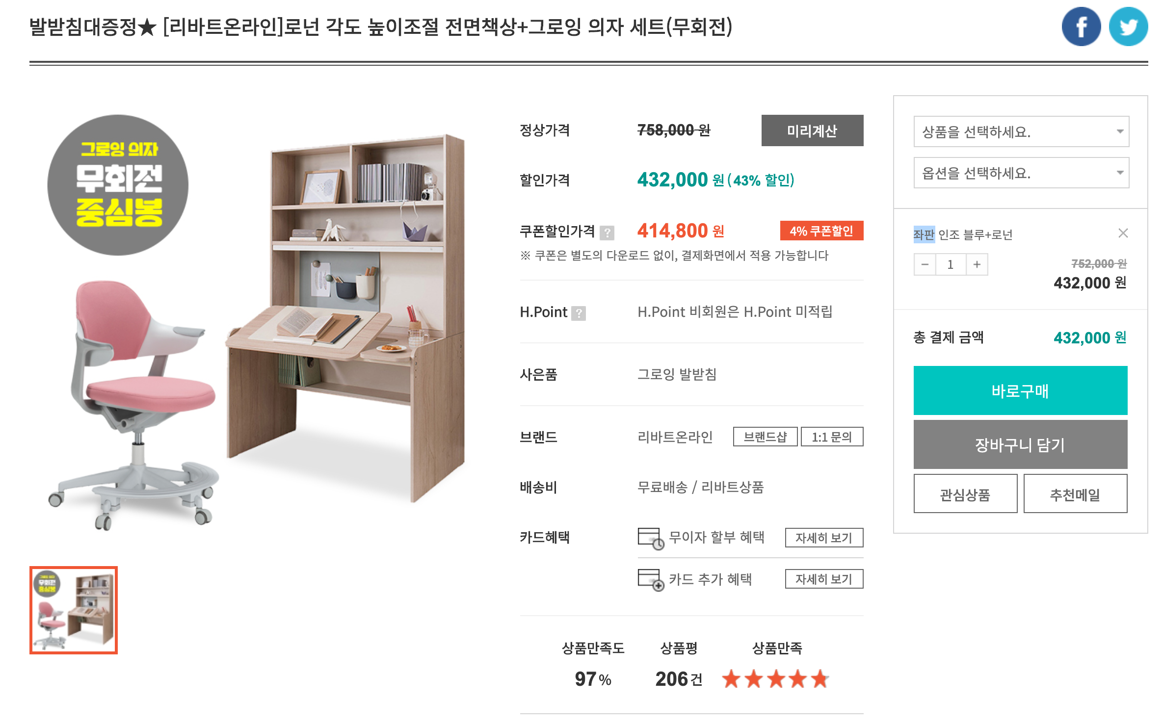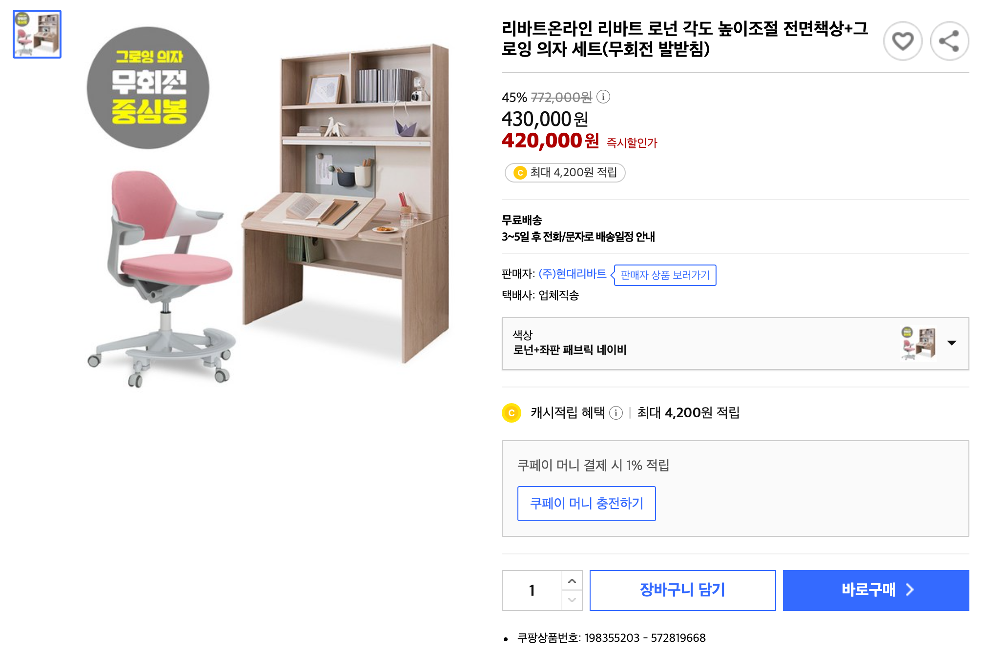 아이 공부방을 위한 책상, 의자 주문. 리바트 로넌 각도 높이조절 전면책상+그로잉 의자 세트(무회전 발받침) 본문