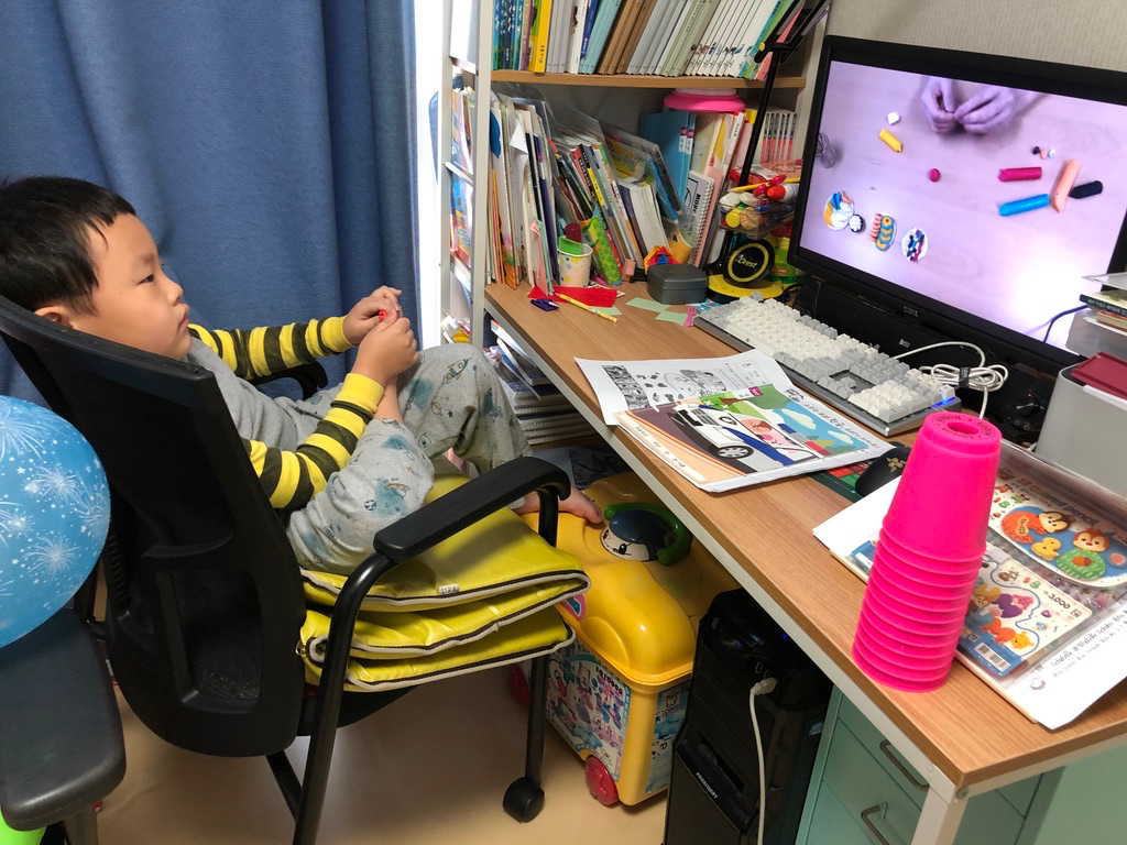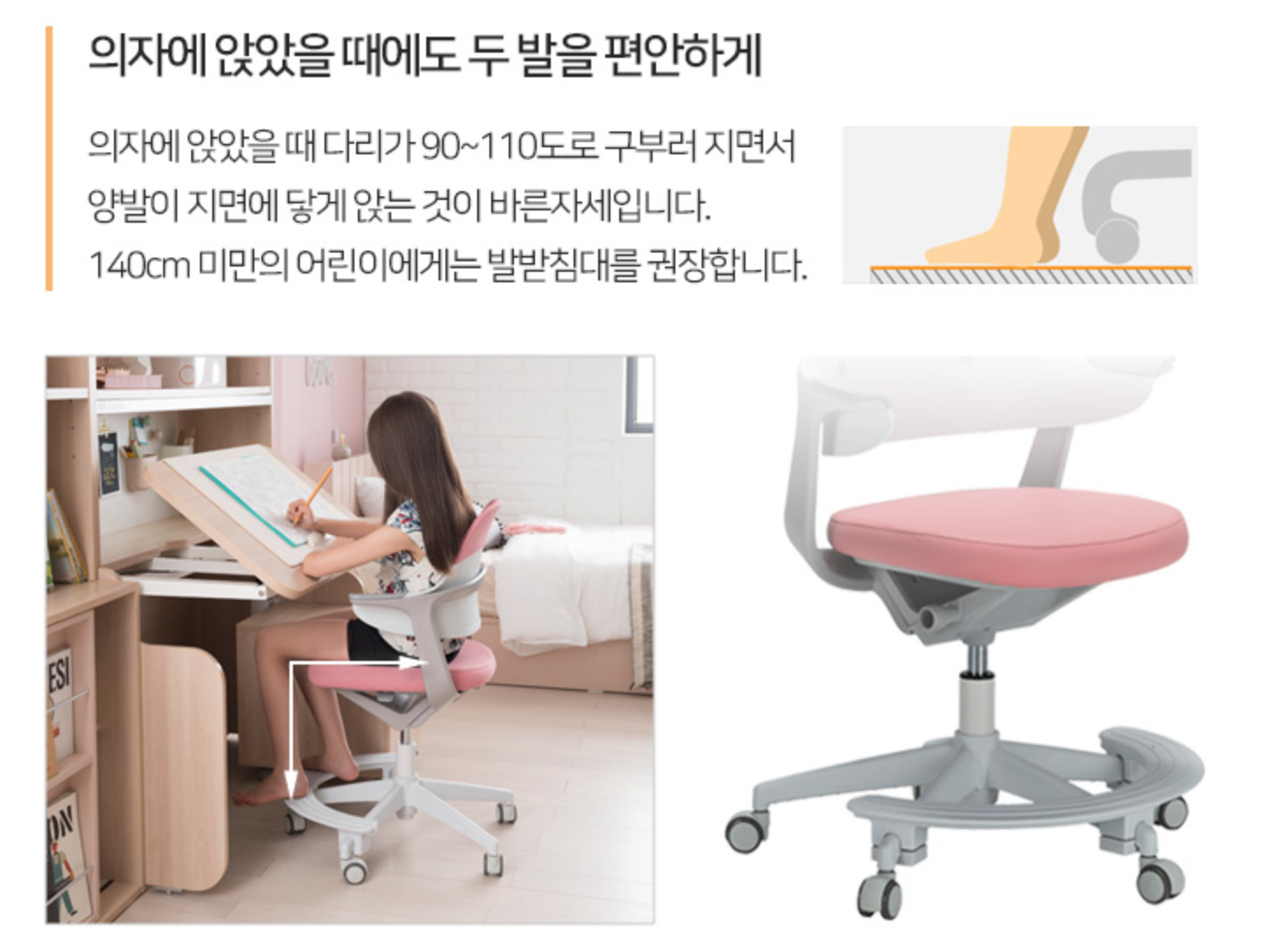 발이 바닥에 닿지 않아서 자꾸 이상한 자세를 하고 있어서 높이와 의자 좌판 등을 성장에 따라 조절할 수 있는 의자도 함께 구입했습니다. 발 받침대도 포함해서요.