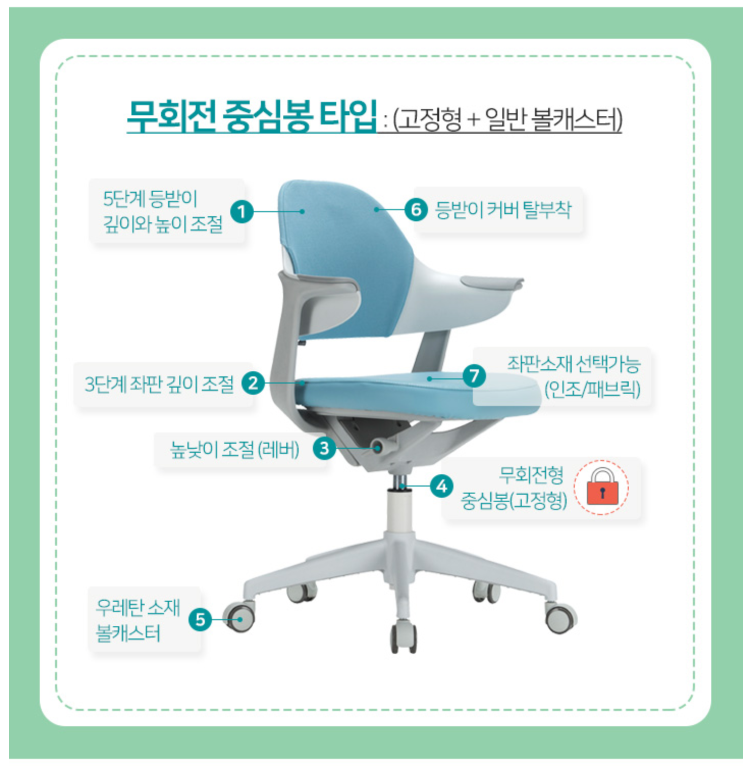 아이가 회전의자에 앉으면 자꾸 의자를 돌리면서 놀아서 무회전형 중심봉(고정형)으로 선택했고요.