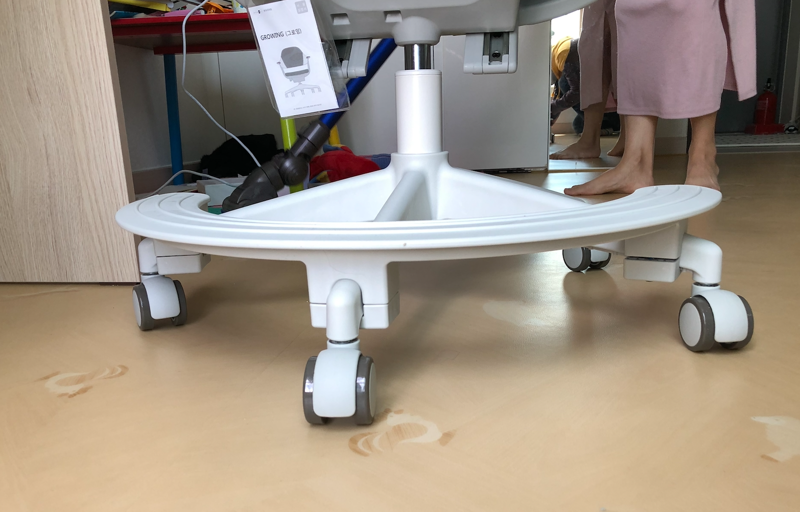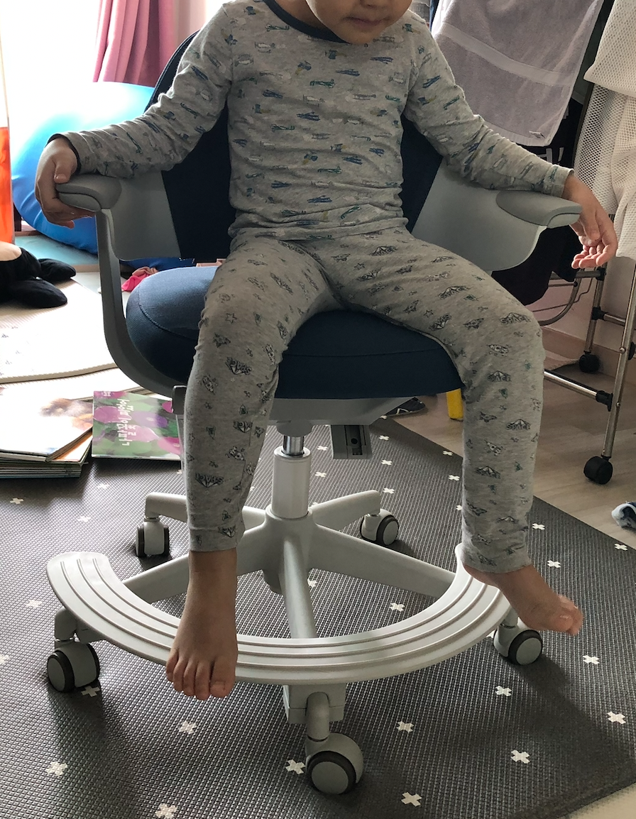 책상 조립 전에 의자를 먼저 조립했고요. 발받침도 있었지만 둘째에게는 여전히 조금 높은 거 같습니다. 그래도 발을 살짝 구부리면 닿긴 하니 다른 의자들 보다는 그래도 괜찮은 거 같습니다. 첫째는 좀 더 크니 괜찮을 거 같네요.