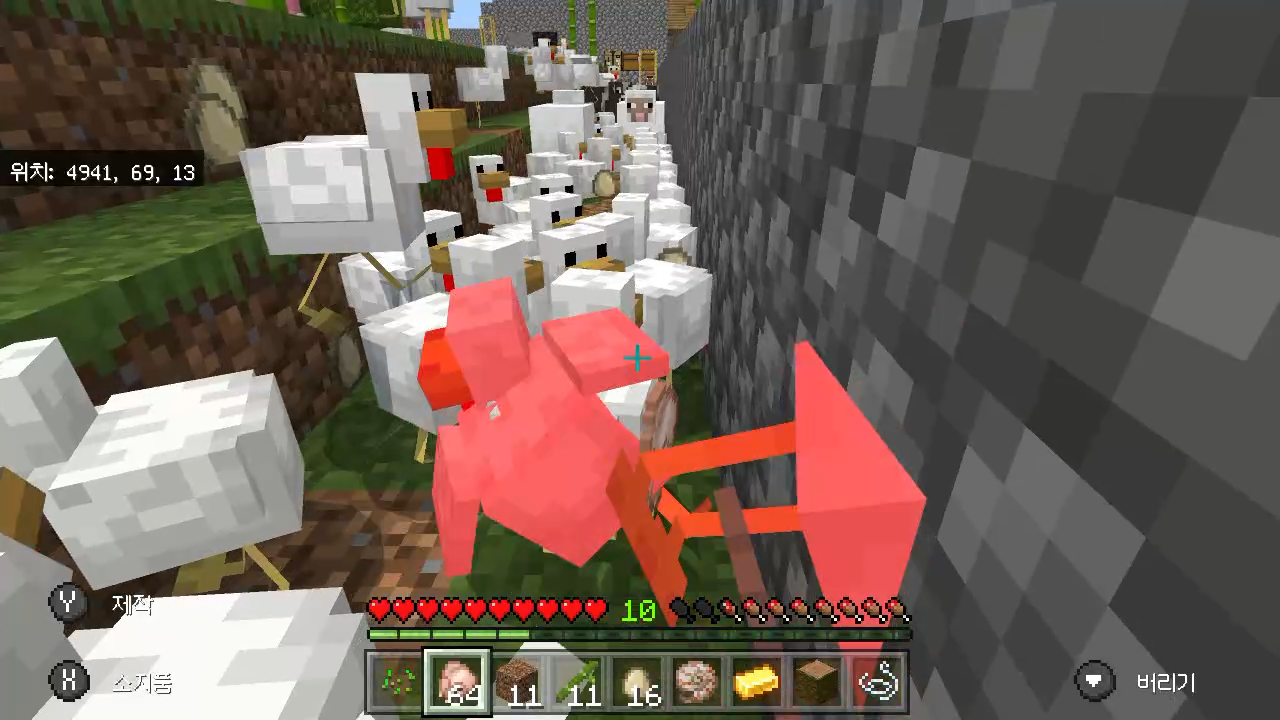 네 번째 마을은 혼자만 있어도 너무 버벅거리고 느렸는데요. 3명이 멀티 플레이를 하면 도무지 감당이 안 될 정도였습니다. 아마도 농장에 닭이 너무 많아서 그런 게 아닐까 싶어서 닭들을 좀 잡았습니다. 원래 닭이 이렇게 많지는 않았었는데요. 아이들이 자꾸 농장의 동물들을 죽여서 죽이지 말랬더니 죽이지는 않았는데요. 대신 달걀 던지기 놀이를 하면서 닭을 엄청나게 많이 만들었더군요. (씨앗으로도 번식을 시킬 수 있지만 달걀을 던져서 깨뜨리다 보면 종종 병아리가 나오기도 합니다.) 닭을 200마리 이상 잡고 나니 버벅거리던 게임이 좀 더 원활해진 거 같습니다.