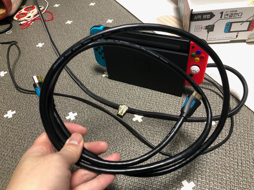 다른 건 전부 정품 구성인거 같은데 HDMI케이블은 따로 구입한 케이블인 거 같습니다. 동작하는 건 아무 문제 없습니다.