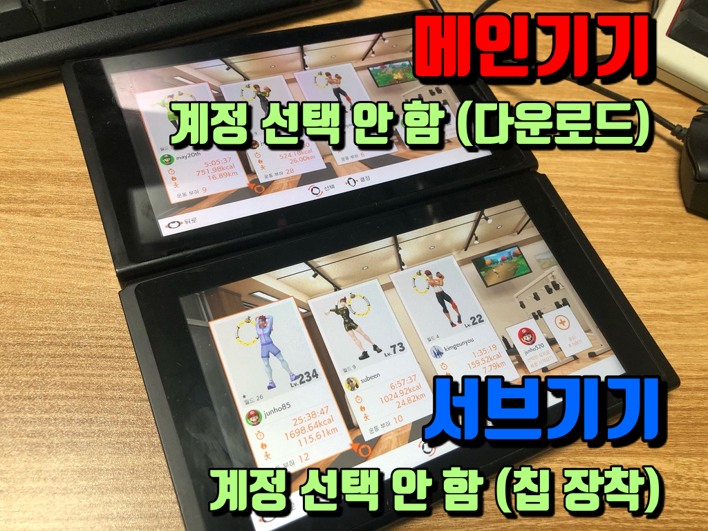 링 피트를 조금은 다른데요. 링 피트를 칩 버전으로 플레이하면 게임을 실행시킬 때는 계정을 선택하지 않고 시작합니다. 게임 내부로 들어와서 사용자를 선택하게 됩니다. 다운로드 버전으로 플레이하면 게임을 실행시킬 때 계정을 선택하고 시작합니다.