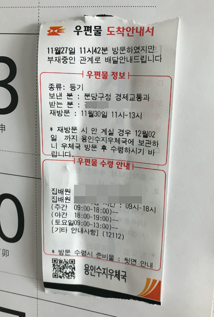 아내가 보내준 사진입니다. 집을 잠깐 비운 사이 등기우편배달부가 왔다 갔는지 이런 종이가 한 장 붙어 있었다고 하네요. 교통과에서 보낸 등기우편이라면 뭔가 벌금을 내야 될 확률이 높습니다.