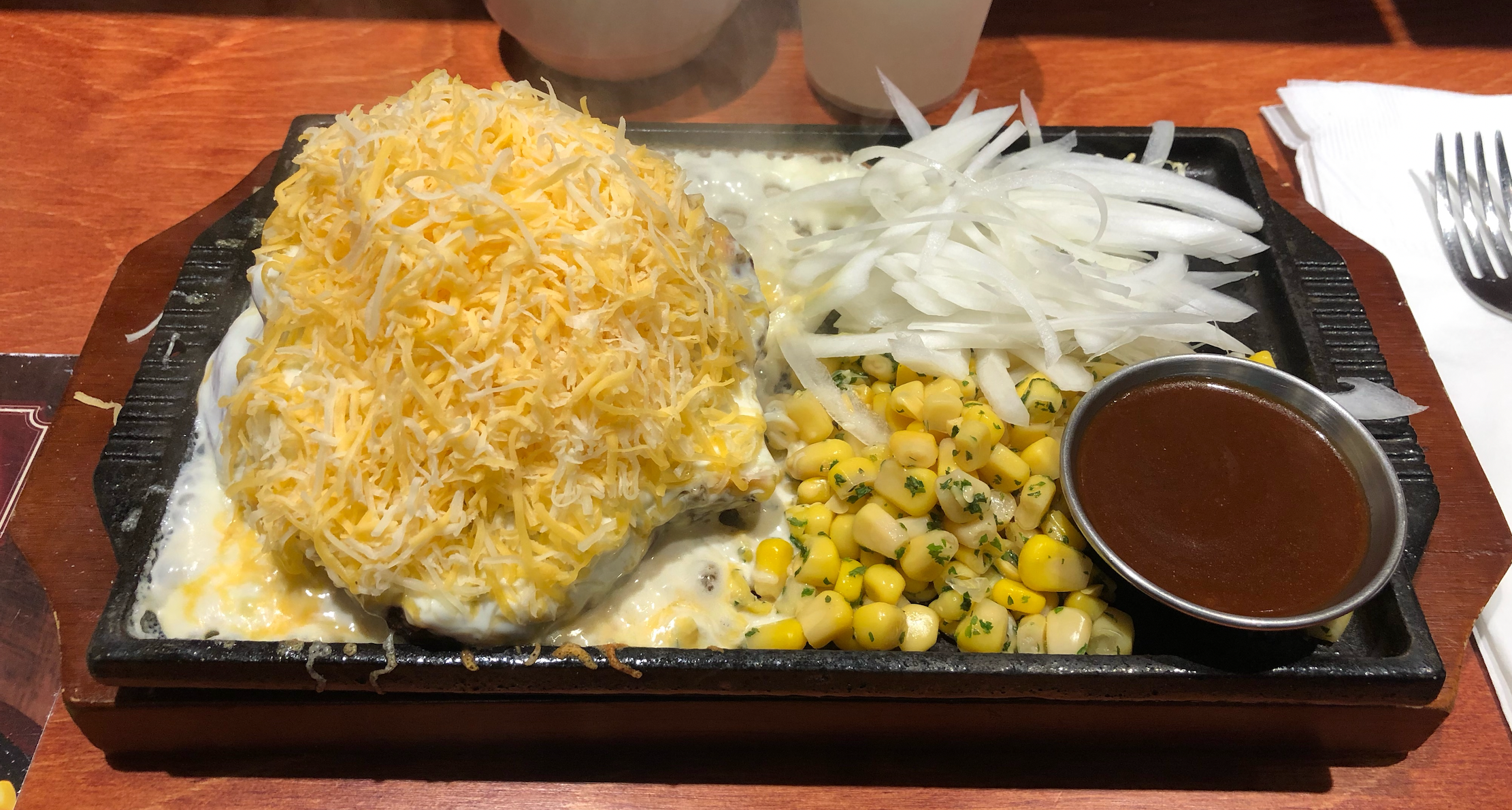 저녁은 좀 비싼 볼케이노 치즈 스테이크 미디엄을 먹어 보았습니다. 미디엄이라 고기양이 좀 더 많고요. 치즈가 잔뜩 올라가 있습니다. 그리고 소스도 다른 소스가 나옵니다. 보통 스테이크 집에서 먹던 좀 더 진한 맛의 소스 같습니다.