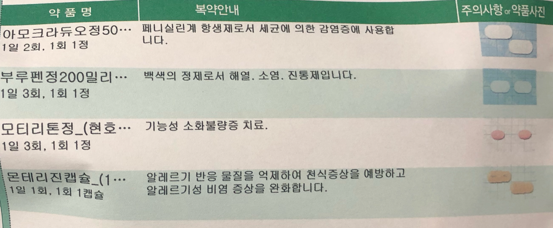항생제, 소염 진통제, 소화제, 알레르기 완화제를 처방받았습니다.