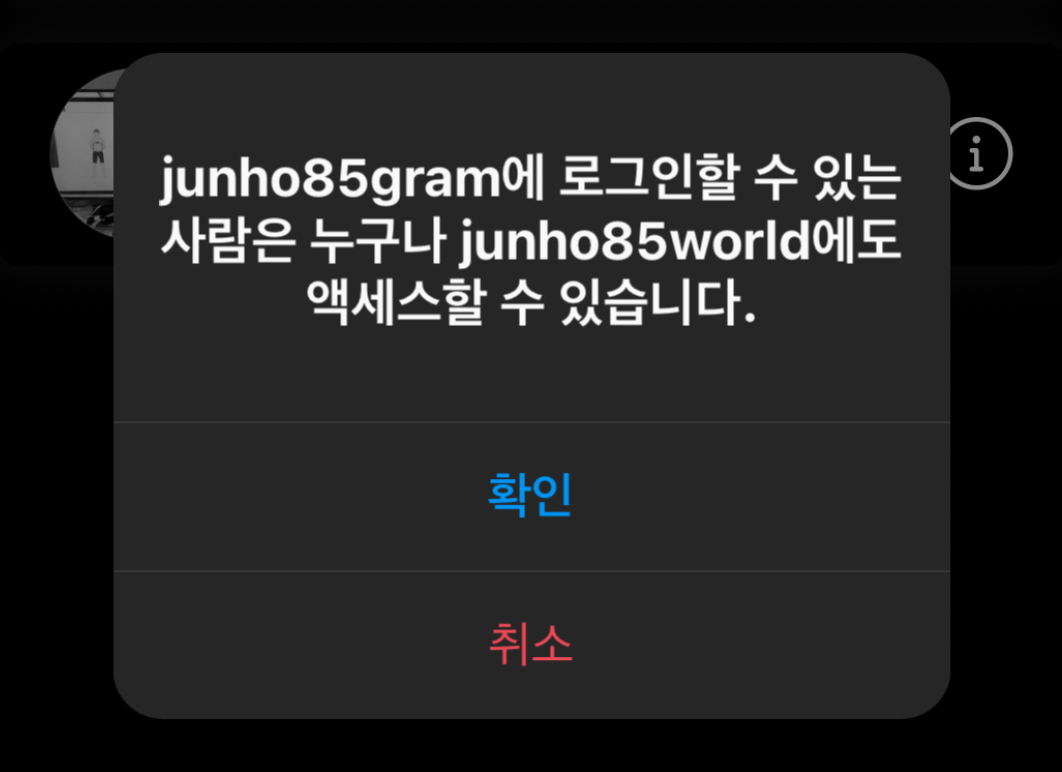 계속 진행하면 주의사항이 나타납니다. 저의 기본 계정인 junho85gram으로 로그인하면 새로 만든 junho85world에도 접근할 수 있다고 나옵니다.