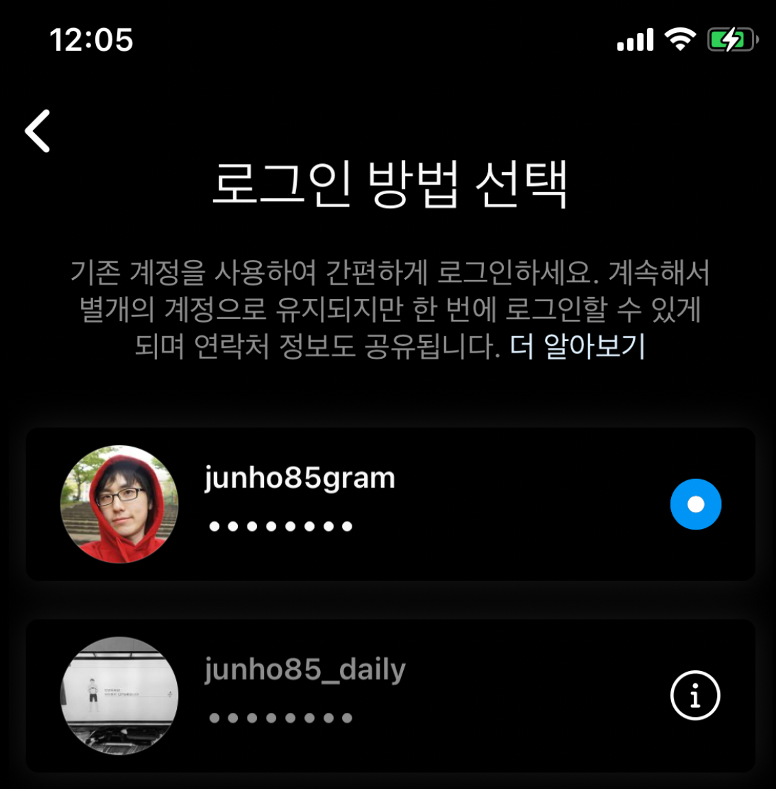 로그인 계정은 하나인데 인스타그램은 여러 개를 운영할 수 있더군요.