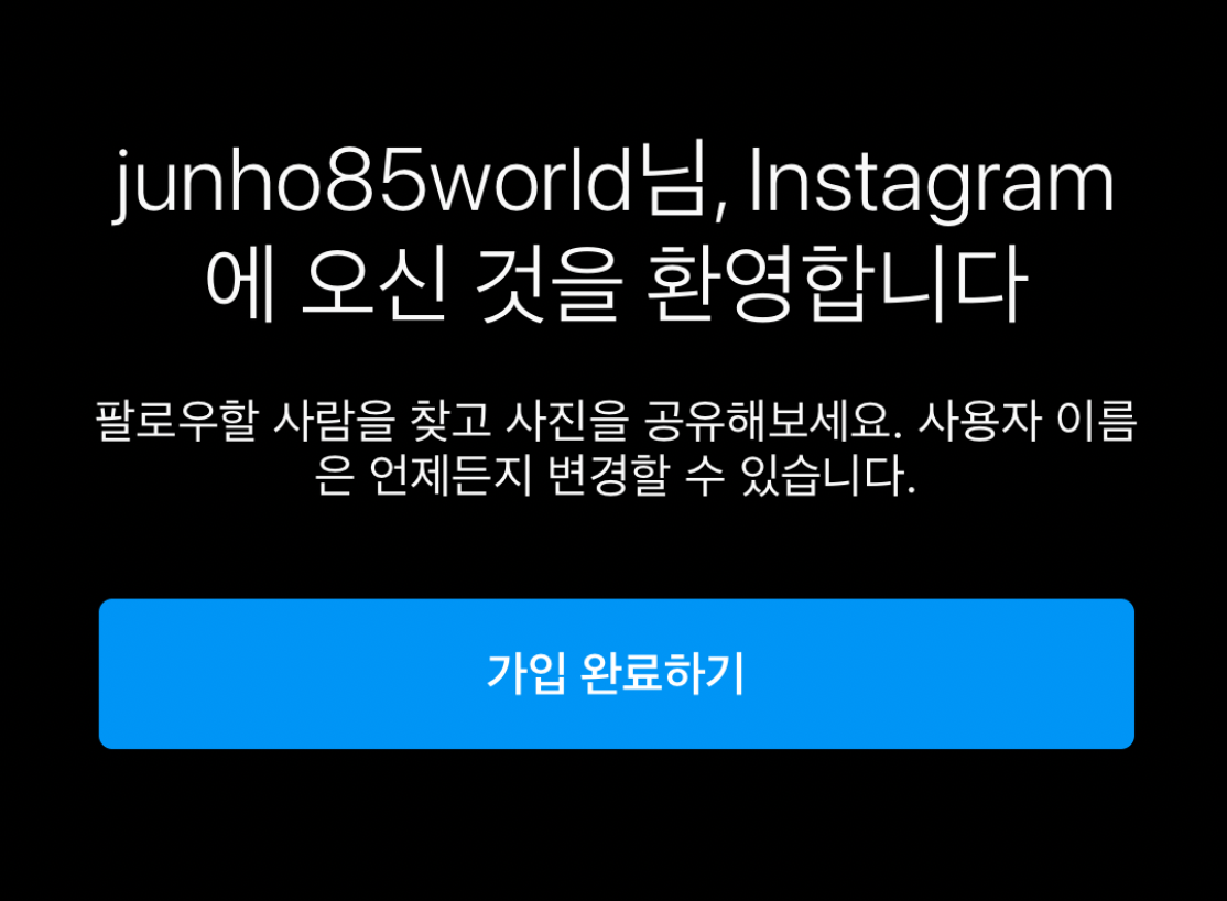 가입 완료하기를 누르면 프로필을 설정하고 지인들을 팔로우하는 등의 설정 과정을 거치고 인스타그램 생성이 마무리됩니다.