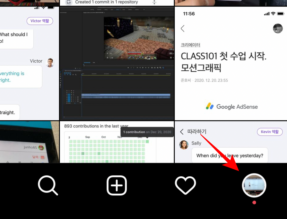 계정 전환을 하는 방법은 우측 하단에 보이는 프로필 사진을 더블 탭 하면 계정이 전환됩니다. 그런데 최근에 사용한 두 개의 계정 간으로만 전환됩니다. 만약 계정이 3개 이상이라면 화면 상단의 아이디를 탭 합니다.