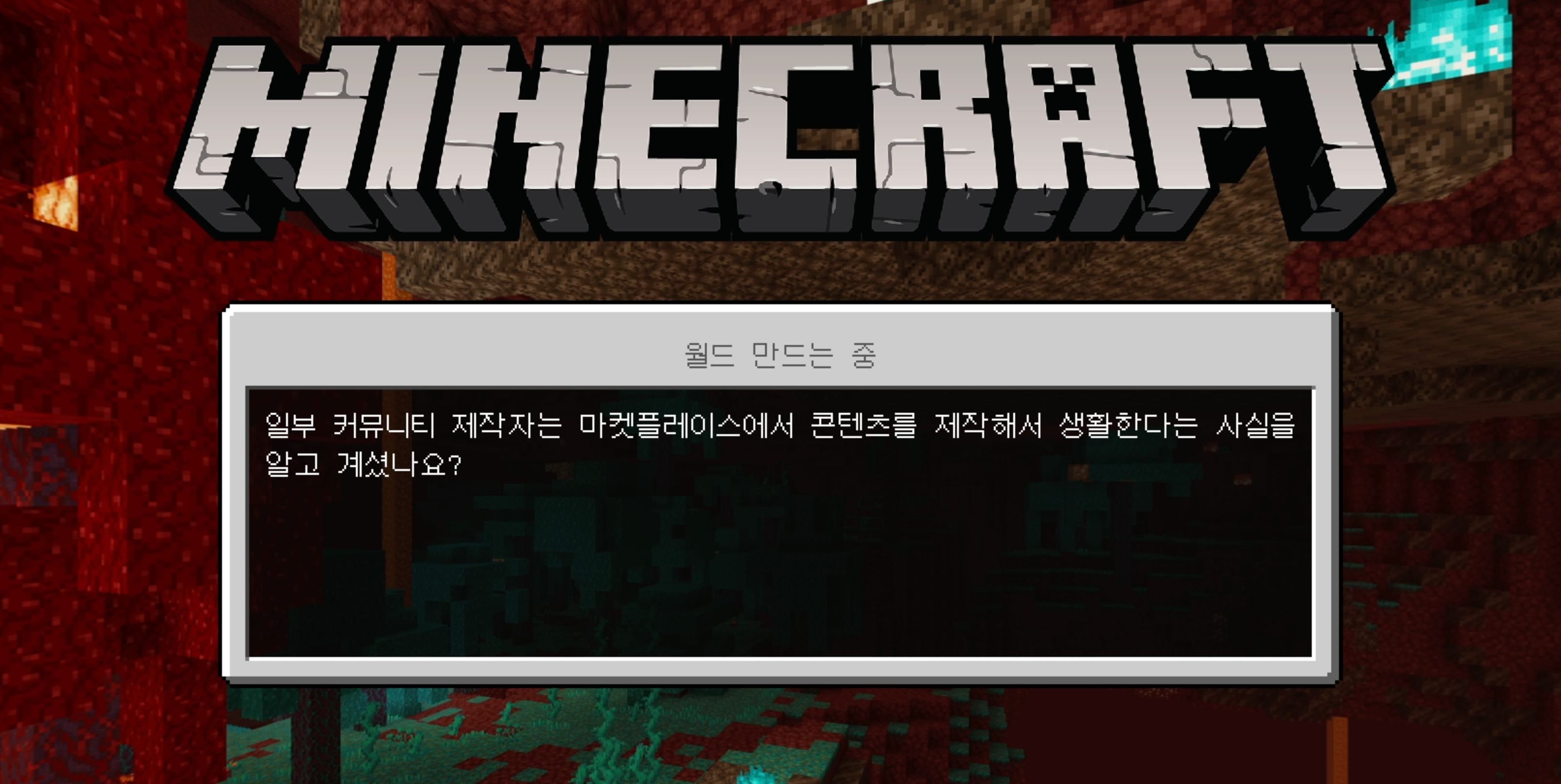 마인크래프트 로딩 화면에는 게임 속 마켓플레이스에서 수익을 얻는다는 이야기가 반복되어 나타납니다.