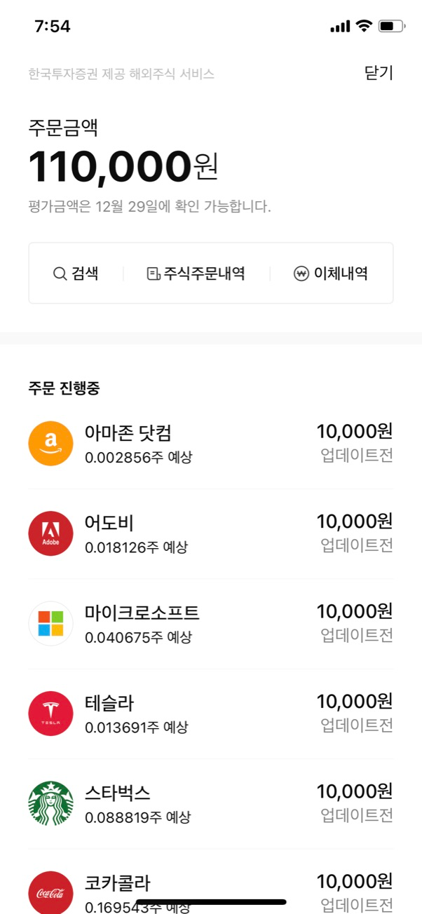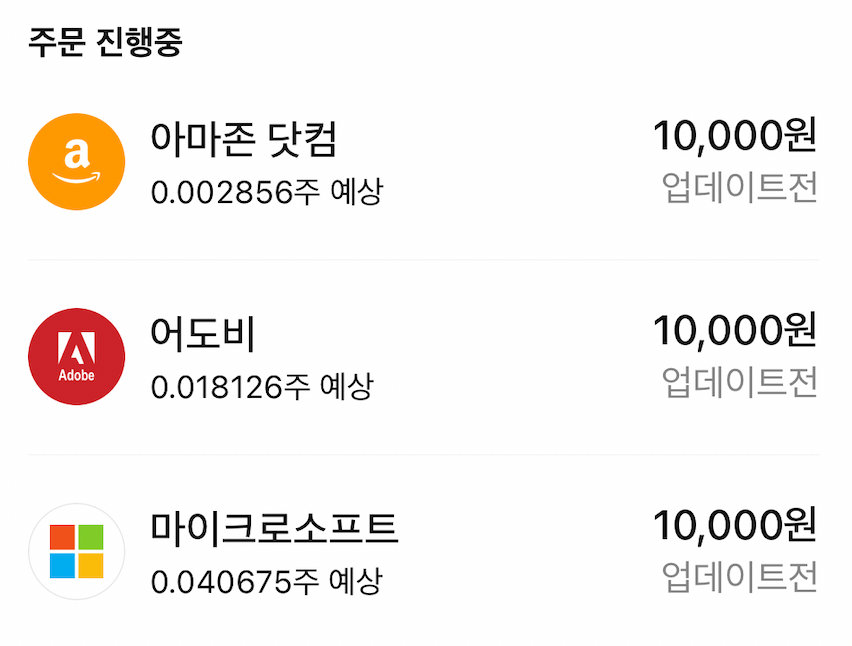 그래서 제가 주문을 진행하고 있는 내역에도 0.002856주처럼 소수점 단위가 나옵니다. 꼭 코인을 거래하는 느낌입니다.