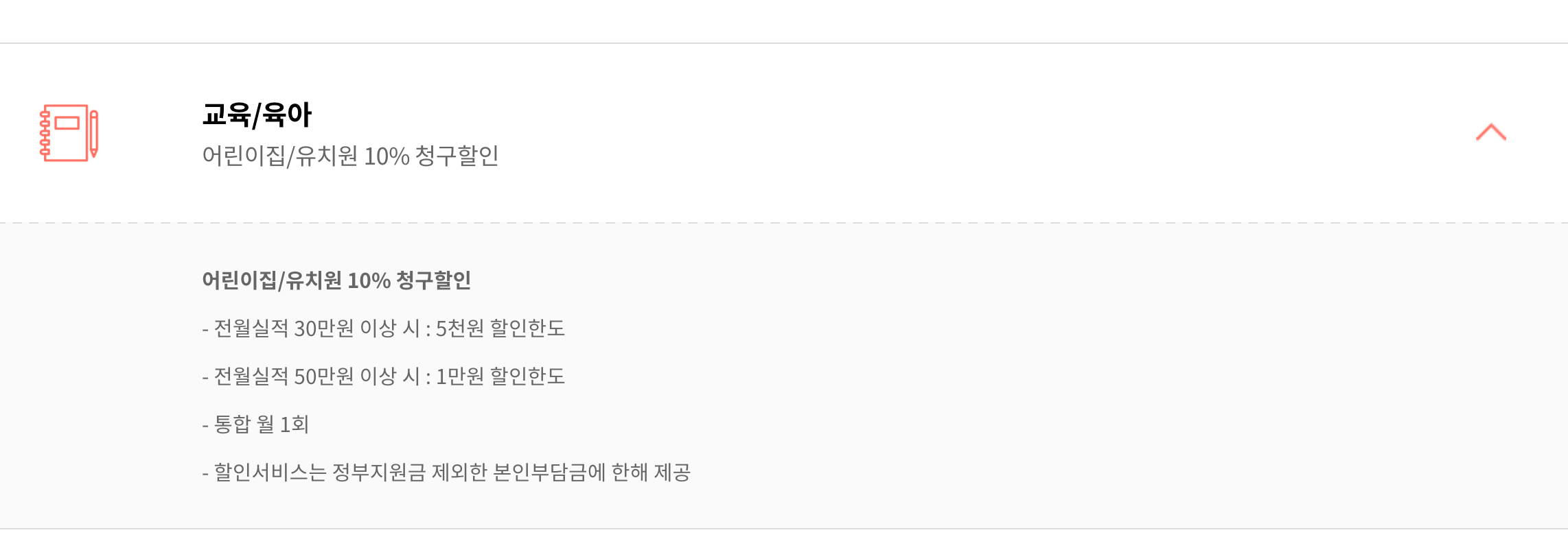 어린이집/유치원 10% 할인이 되지만 전월 실적에 따라 할인한도가 있습니다.