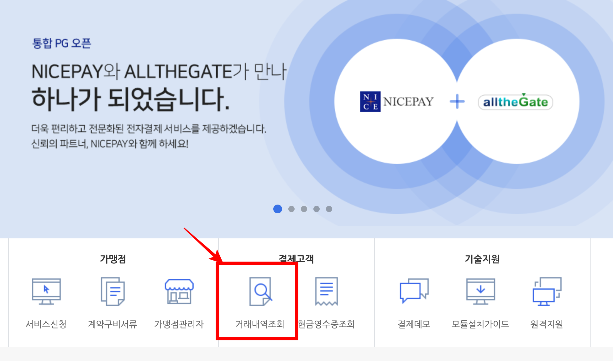 나이스 페이 홈페이지에 들어가 보니 거래내역 조회가 있습니다.