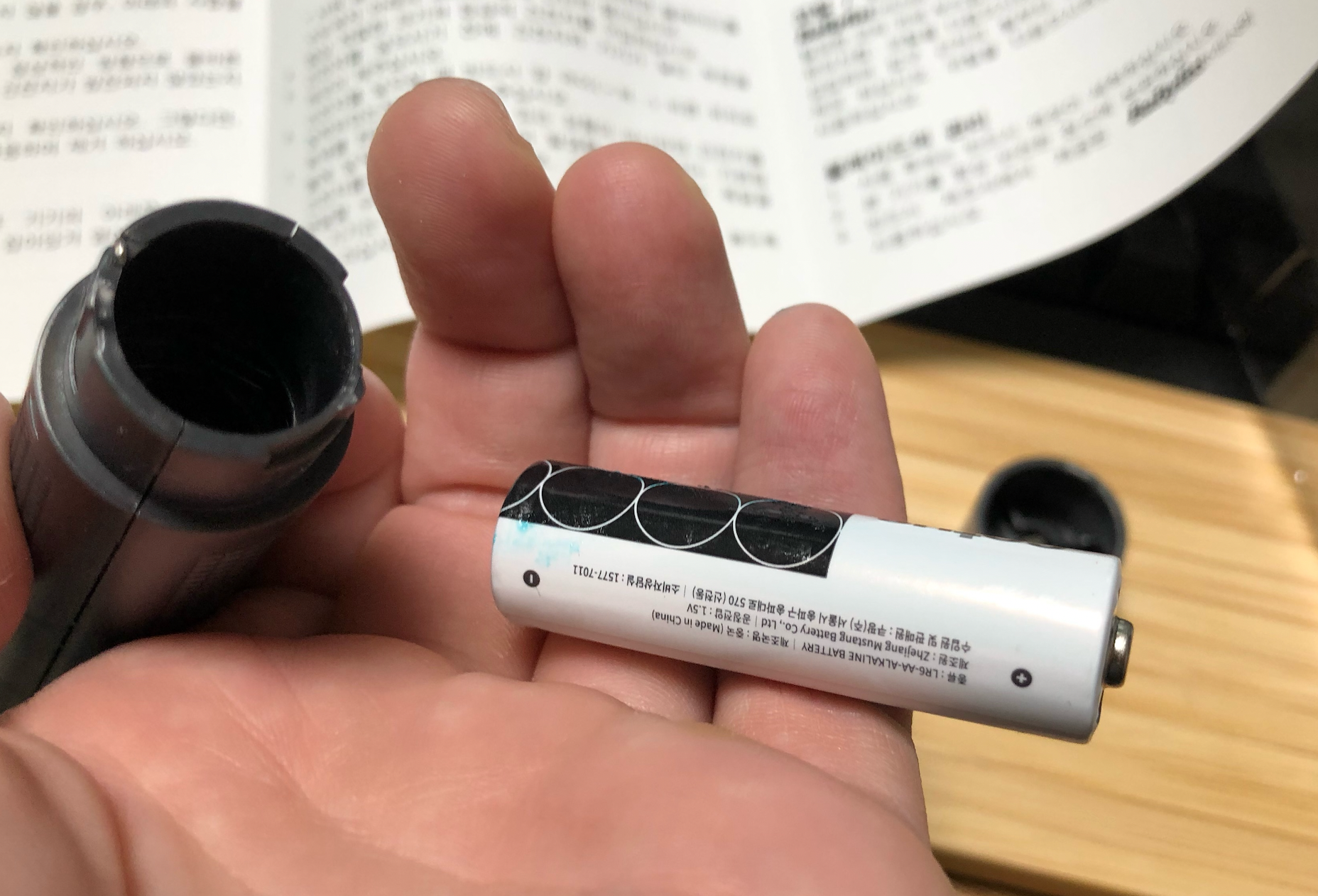 건전지는 AA 전지 하나가 들어갑니다. 하나밖에 안 들어가는데 오랫동안 사용 가능하다니 신기하네요. 전력 효율이 좋은가 봅니다.