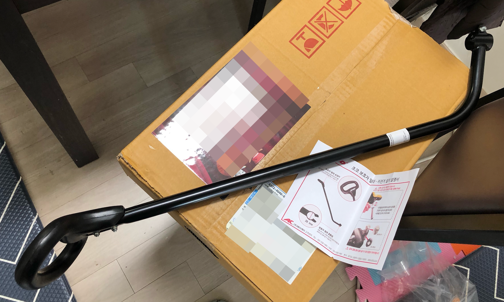 보호자 밀대 설치 전 모습입니다. 보조바퀴를 떼어낸 상태인데 스탠드도 아직 붙이지 않은 상태입니다.