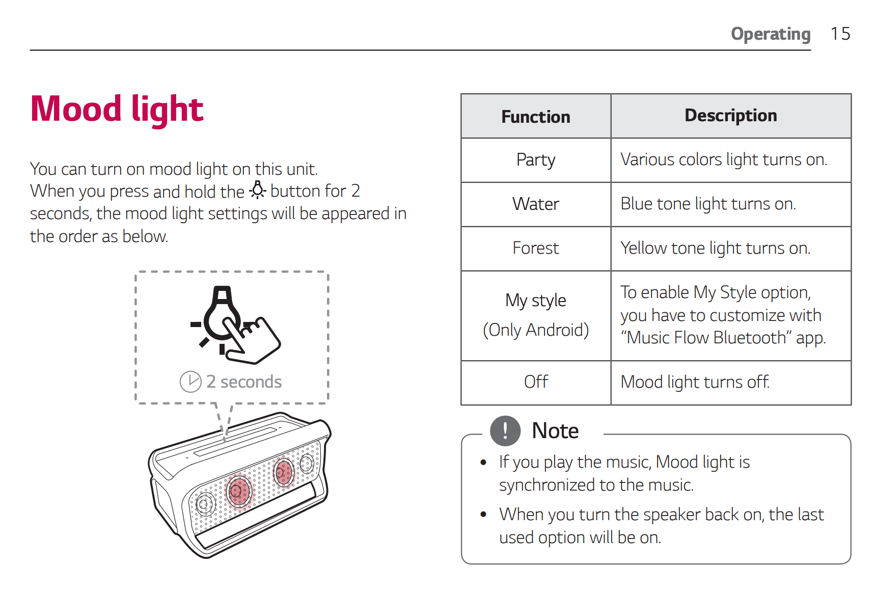 전구 모양 버튼을 2초간 누르면 Party -> Water -> Forest -> My style -> Off 순으로 바뀐다고 합니다. 2초간 여러 번 누르다 보면 무드등 기능을 끌 수 있다는 말입니다.