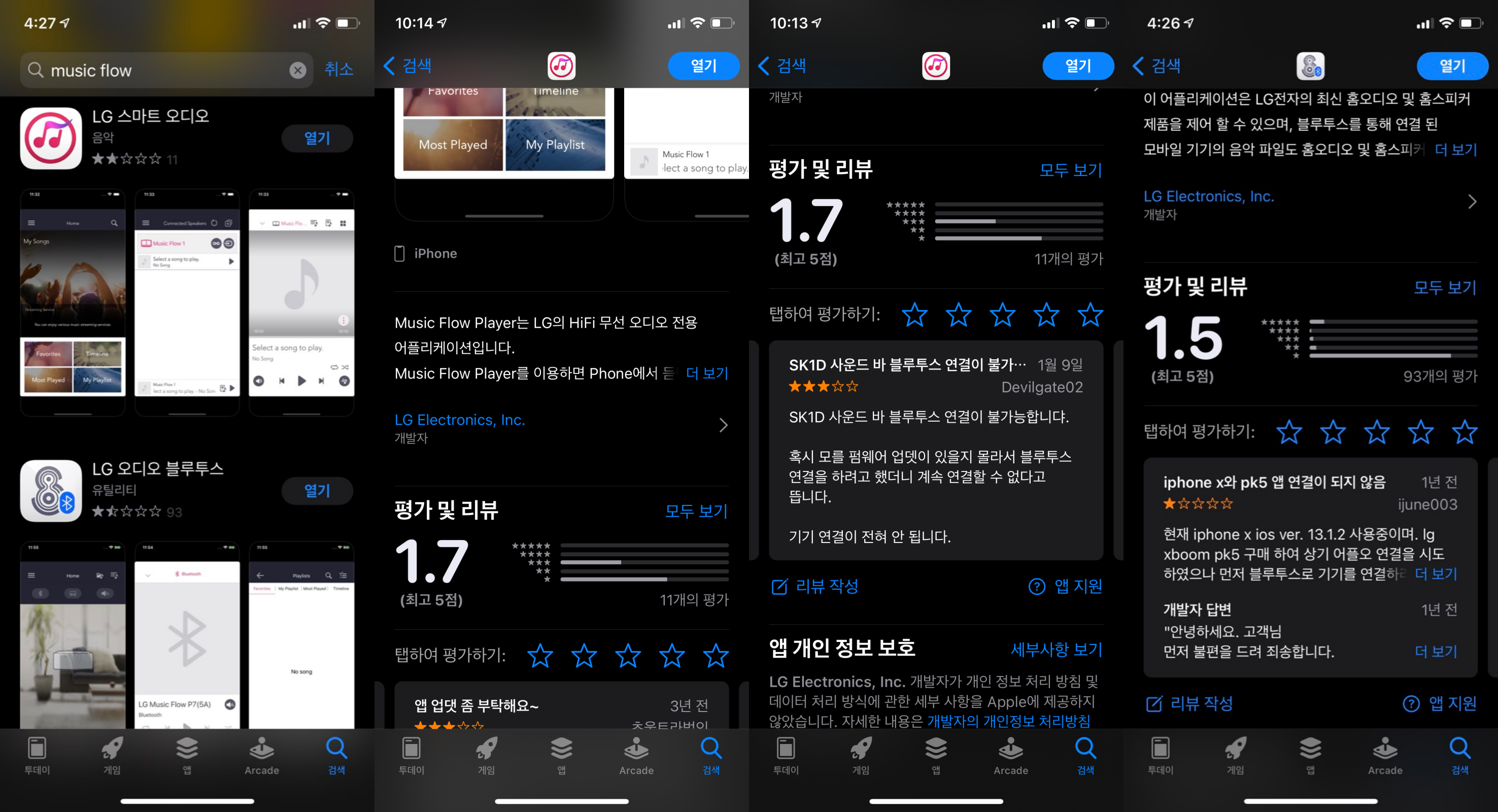 music flow로 검색했을 때 나오는 LG 스마트 오디오 앱이 music flow앱인 거 같은데요. 평가 및 리뷰에도 보이듯이 연결이 안 된다는 문의가 많습니다. 혹시 아래쪽에 있는 LG 오디오 블루투스 앱인가 싶기도 한데 여기 평가도 마찬가지입니다.