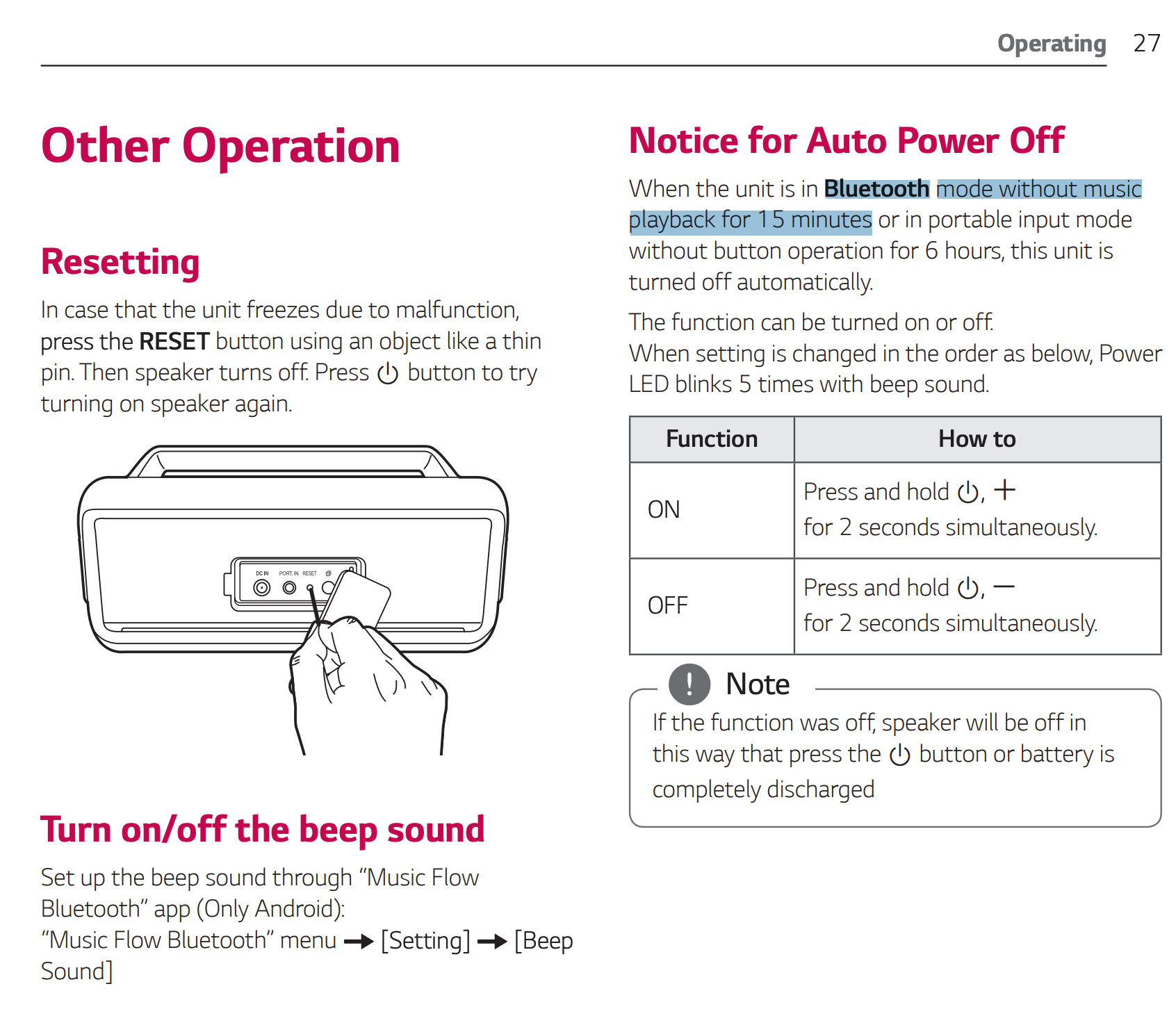 LG 메리디안 엑스붐Go PK7 무드등 끄기. 자동 전원 차단 기능 끄기. 본문