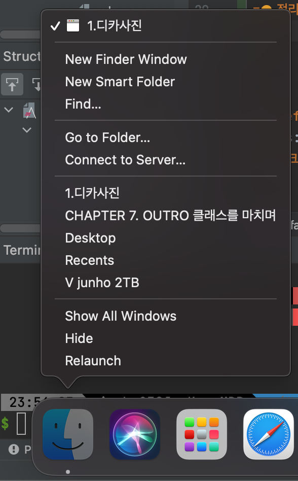 독에 보이는 Finder아이콘을 Opt를 누른 상태로 마우스 우클릭을 합니다.