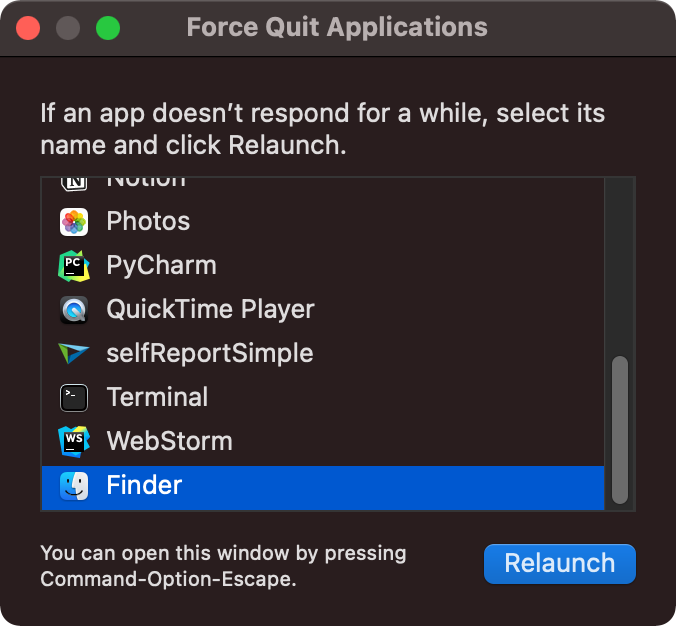 여기서 Finder를 선택하고 "Relaunch"버튼을 누르면 Finder가 재시작됩니다.