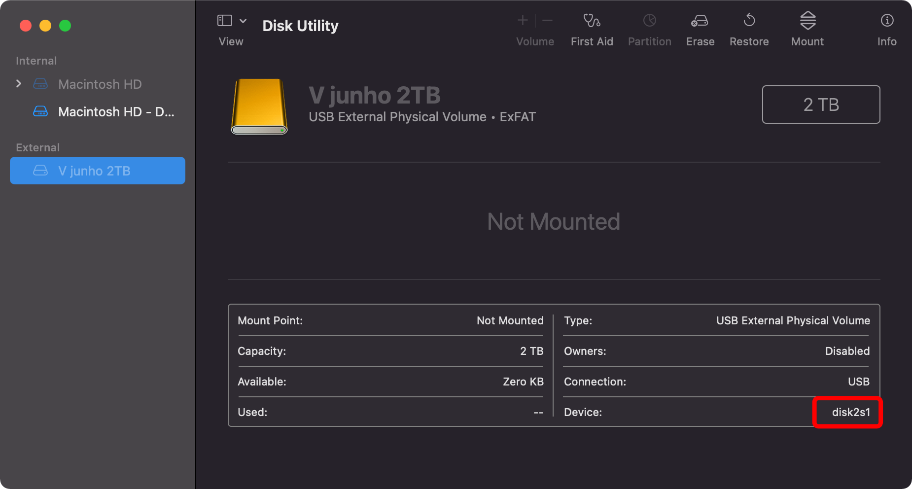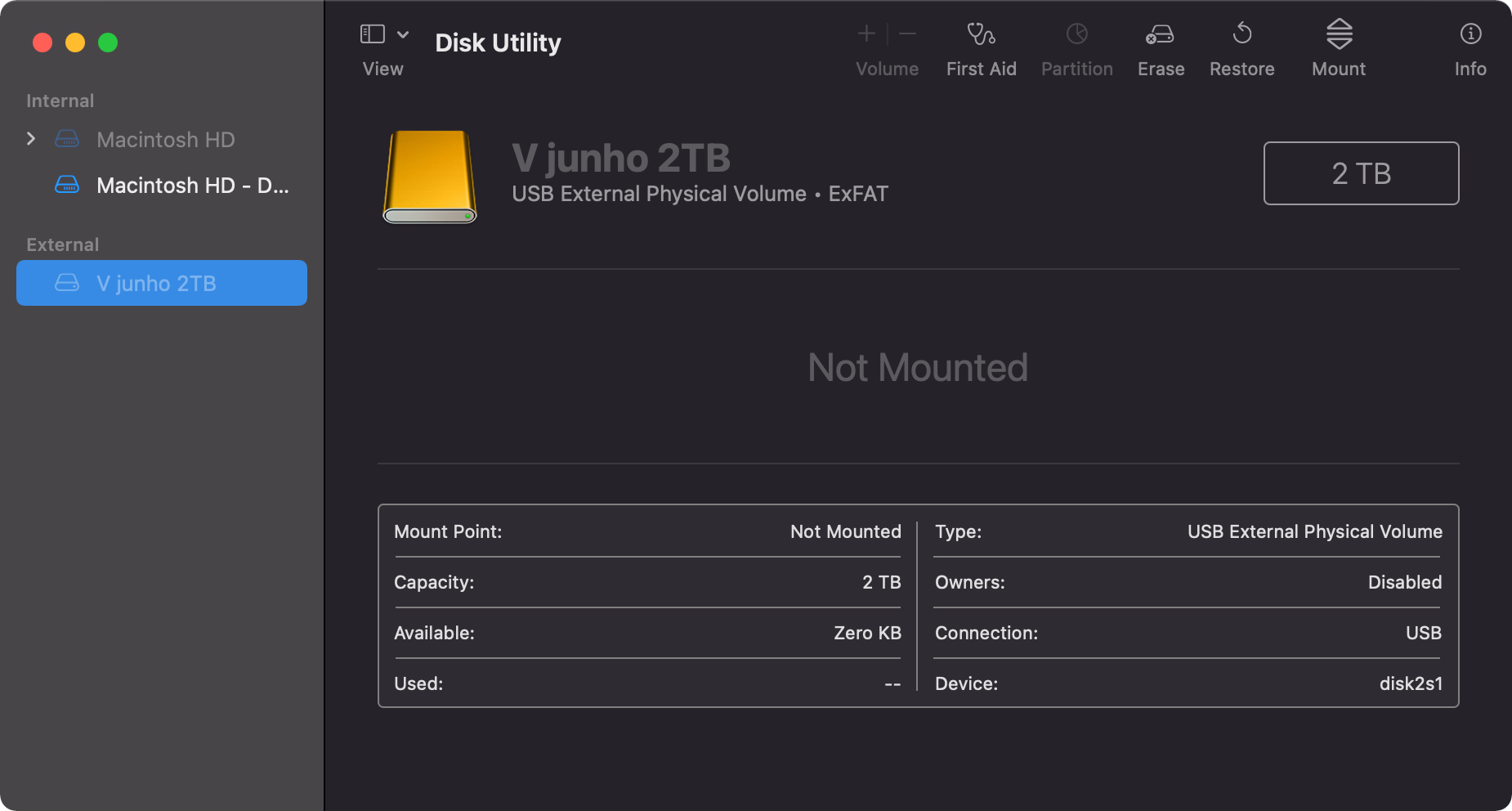 Disk Utility를 열어 보면 디스크를 인식하긴 했지만 마운트가 아직 안 된 상태입니다.