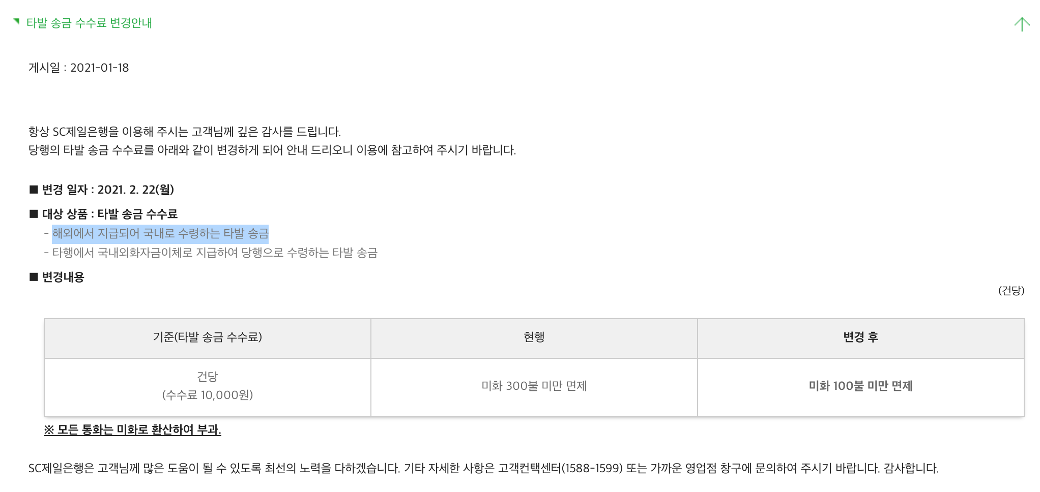 구글 애드센스 수입을 지급받을때 가장 많이 쓰는 SC제일은행, 그 이유는 $300 미만 수수료가 '0원' 이였기 때문인데요. 이제 다음달 부터는 '$100 이상은 수수료 만원' 으로 바뀌게 된다고 합니다. S