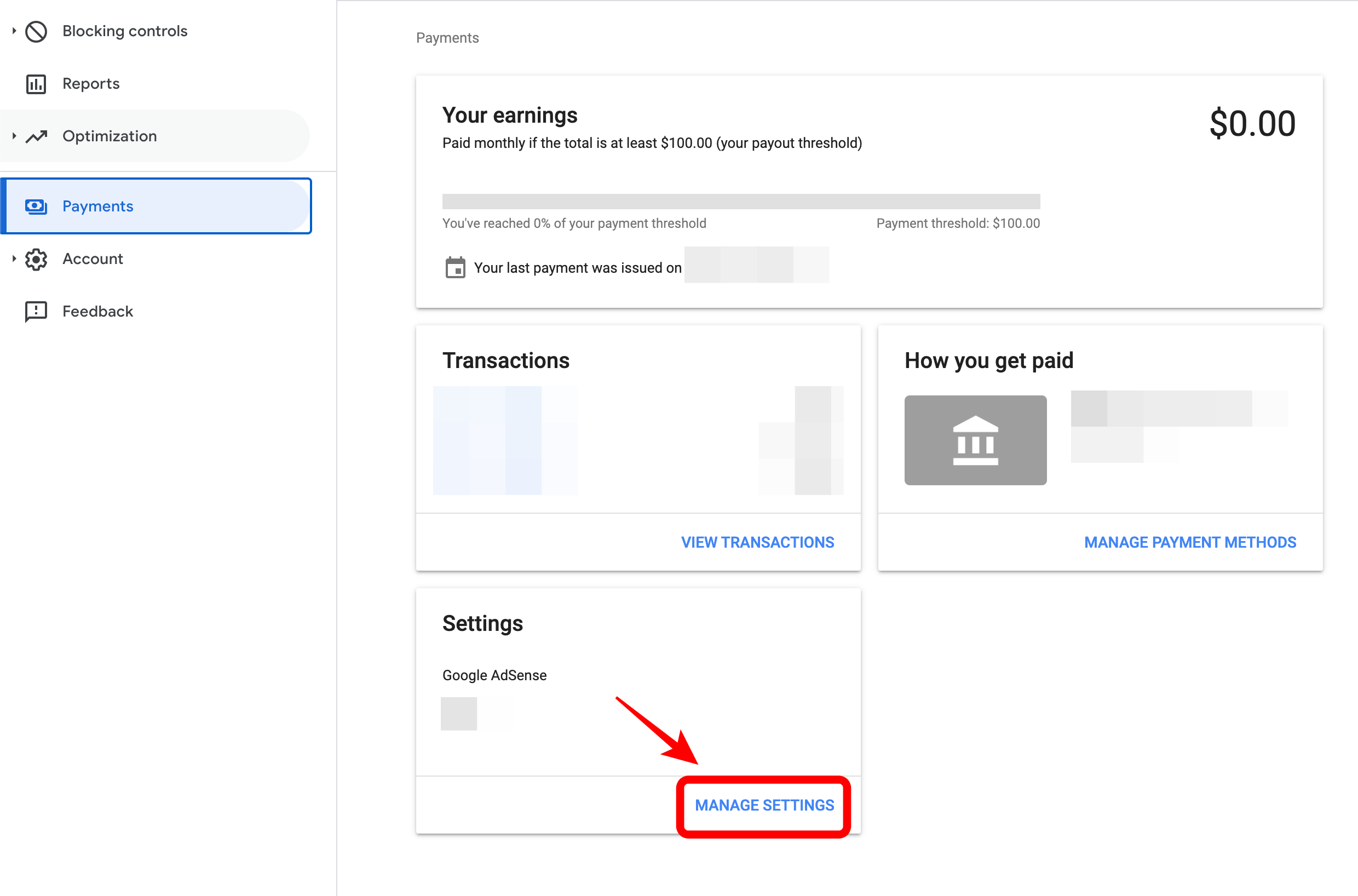 Payments로 들어가서 Settings (설정) -> Manage Settings (설정 관리)로 들어갑니다.