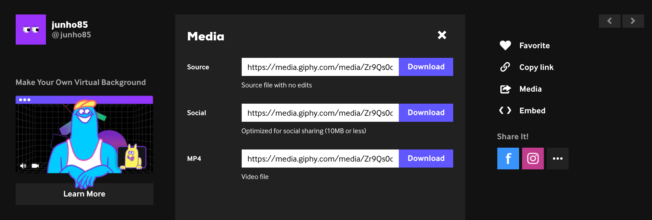 MP4우측의 Download를 누르면 mp4 파일을 다운로드할 수 있습니다. 이 파일을 원하는 곳에 올려서 사용할 수 있습니다.