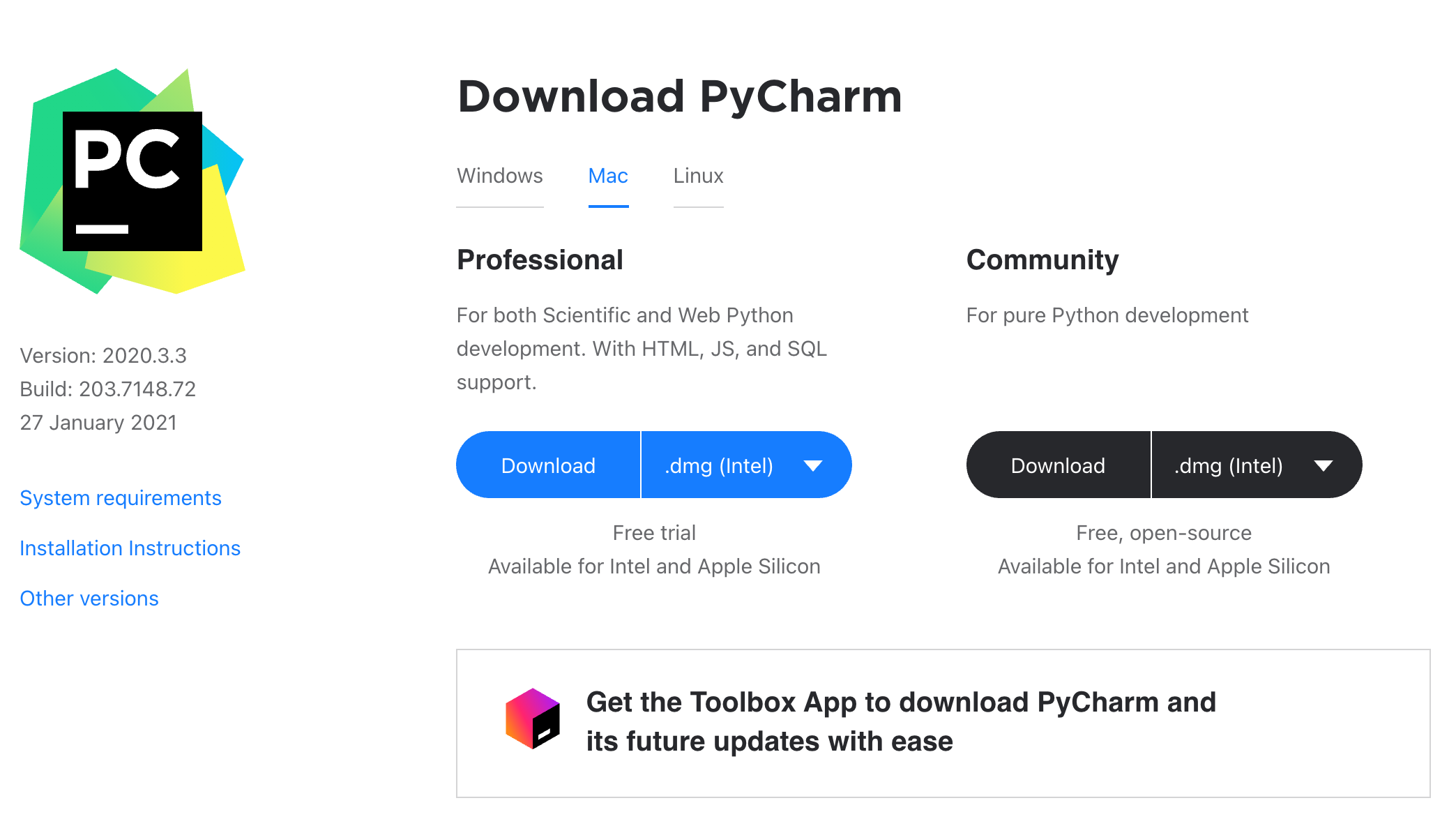 Download the latest version of PyCharm for Windows, macOS or Linux.