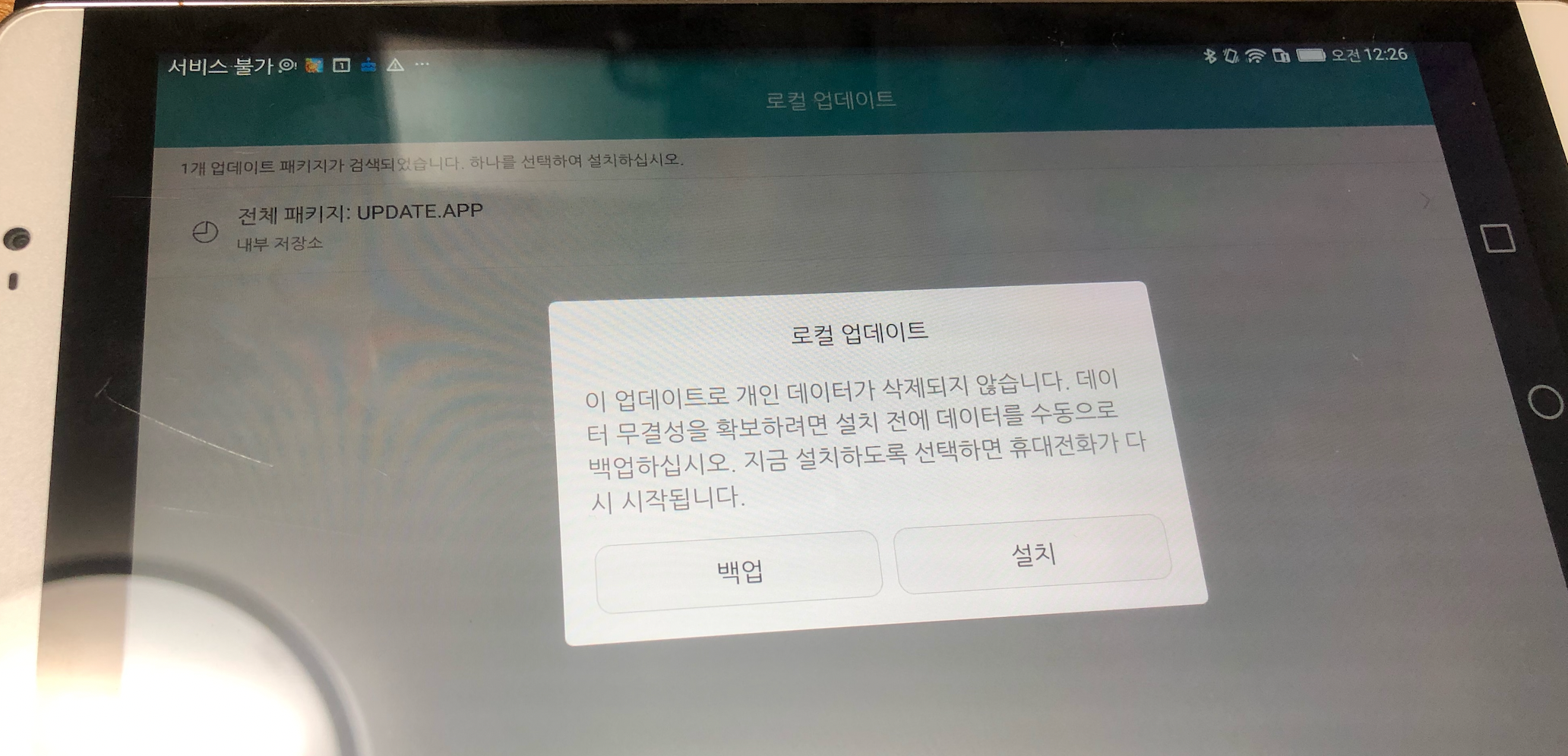 백업을 먼저 하면 좋겠지만 태블릿 용량도 얼마 없어서 UPDATE.APP파일도 겨우 옮겨온 거라 백업은 하지 않고 그냥 바로 설치를 했습니다.