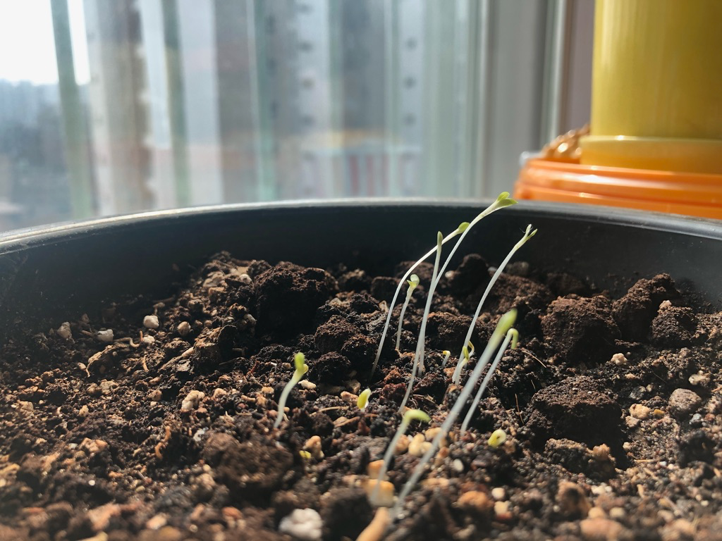 다이소에서 사 온 씨앗이 싹을 틔웠습니다. 아이들이 상추랑 딸기 씨앗을 막 뿌려서 무슨 싹인지는 잘 모르겠습니다. 아마 상추가 아닐까 싶은데 좀 더 크면 뭔지 알 수 있겠죠.