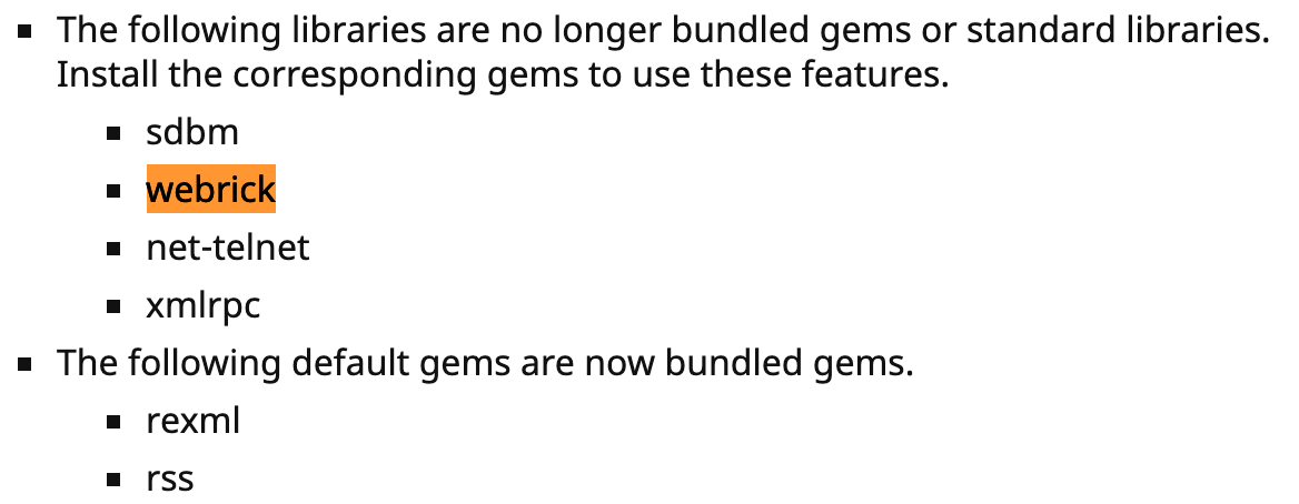 이유는 ruby 3.0.0부터 webrick이 기본으로 포함된 gem에서 빠졌기 때문입니다.