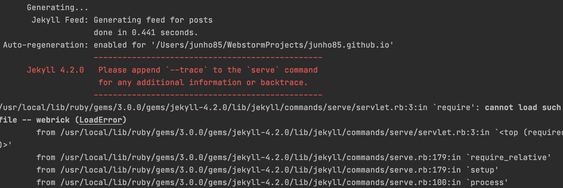 Jekyll 4.2.0 Please append `--trace` to the `serve` command