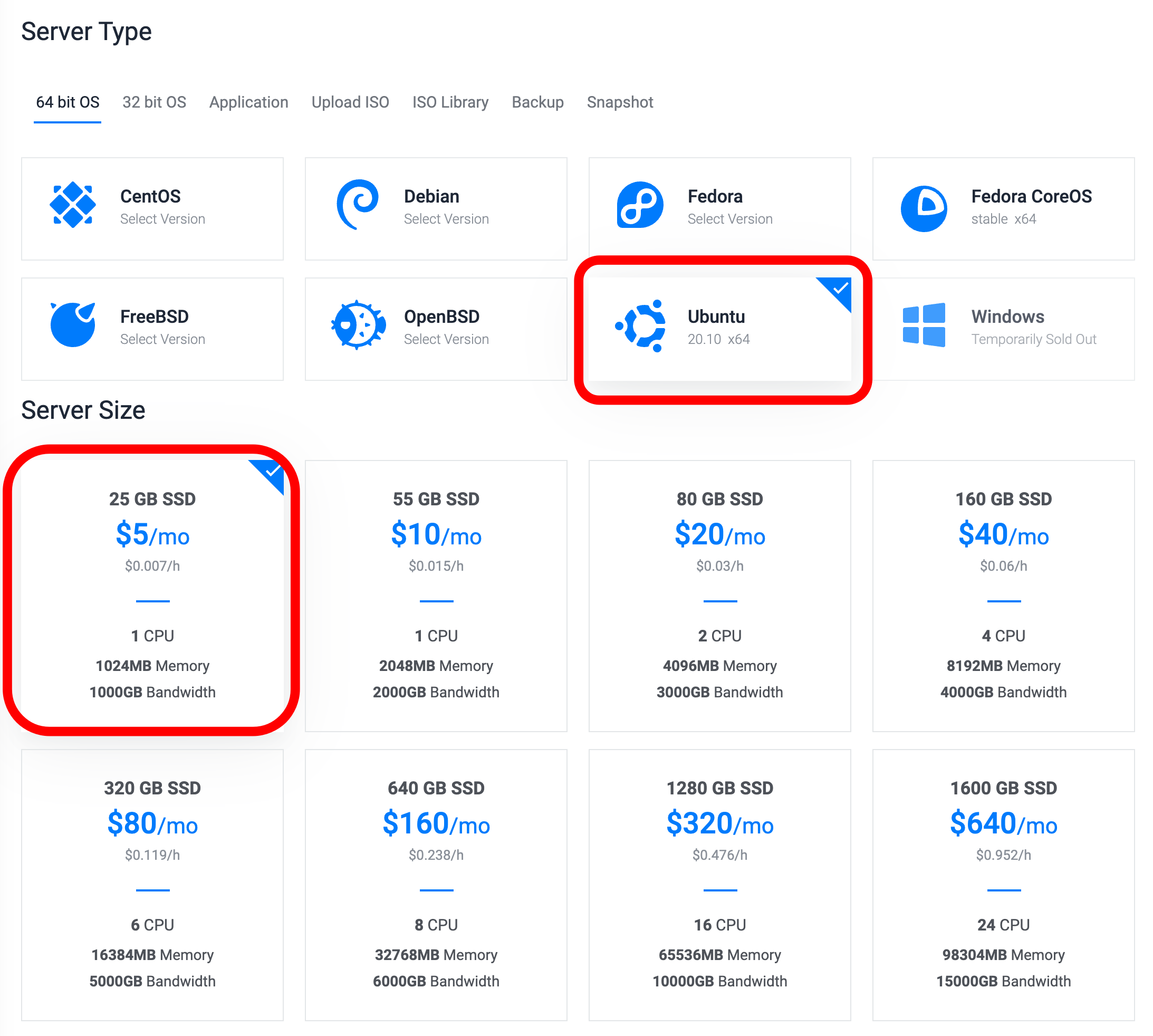 서버 타입은 기존에 사용하던 우분투로 선택하고 서버 사이즈는 25 GB SSD, 1 CPU, 1024MB Memory, 1000GB Bandwidth인 $5/mo로 선택했습니다.
