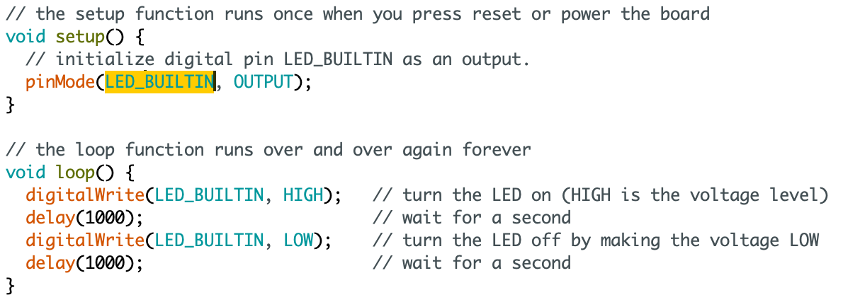 예제 코드에 보면 LED_BUILTIN이 보이는데 보통 책에서는 아두이노 우노 보드 내장 LED를 뜻하고 13번과 연결되어 있다고 나옵니다. 보통 그러려니 하고 넘어갑니다.