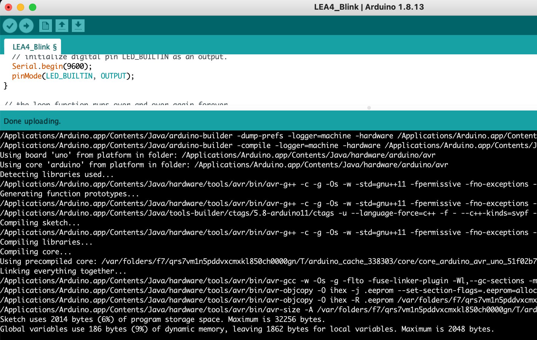 /Applications/Arduino.app/Contents/Java/hardware/tools/avr/bin/avr-g++ -c -g -Os -w -std=gnu++11 -fpermissive -fno-exceptions -ffunction-sections -fdata-sections -fno-threadsafe-statics -Wno-error=narrowing -MMD -flto -mmcu=atmega328p -DF_CPU=16000000L -DARDUINO=10813 -DARDUINO_AVR_UNO -DARDUINO_ARCH_AVR -I/Applications/Arduino.app/Contents/Java/hardware/arduino/avr/cores/arduino -I/Applications/Arduino.app/Contents/Java/hardware/arduino/avr/variants/standard /var/folders/f7/qrs7vm1n5pddvxcmxkl850ch0000gn/T/arduino_build_618791/sketch/LEA4_Blink.ino.cpp -o /var/folders/f7/qrs7vm1n5pddvxcmxkl850ch0000gn/T/arduino_build_618791/sketch/LEA4_Blink.ino.cpp.o