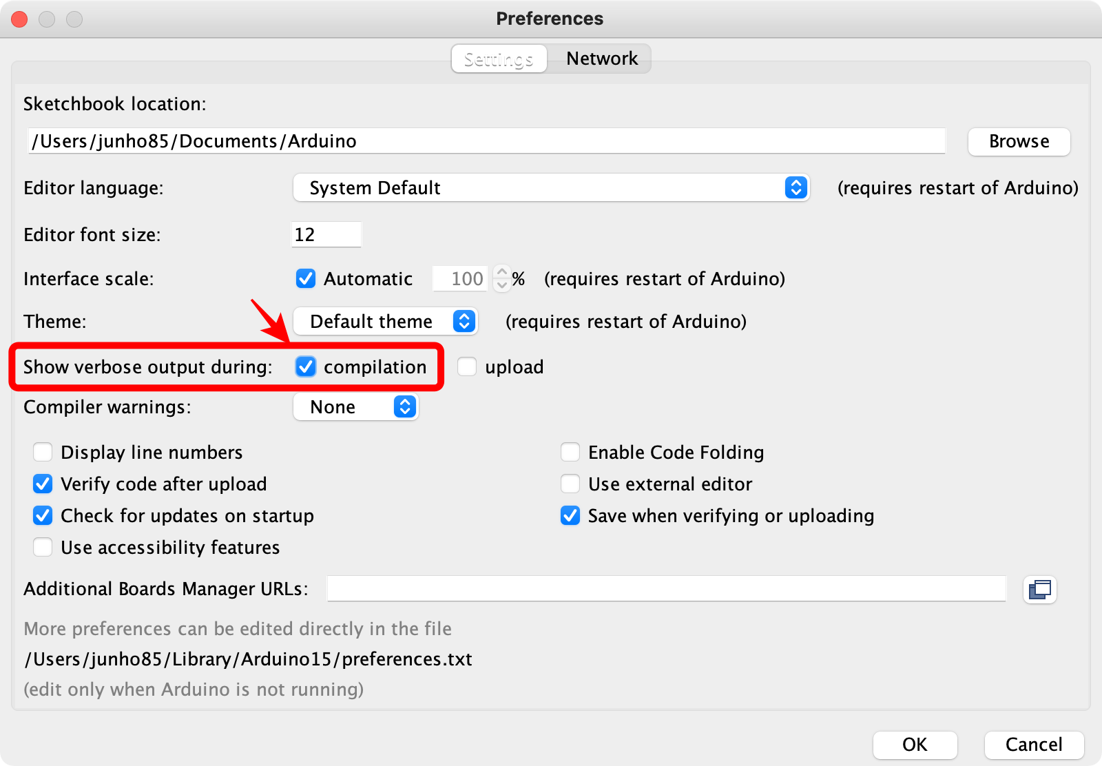 우선 아두이노 IDE에서 작성한 스케치 파일을 먼저 컴파일합니다.