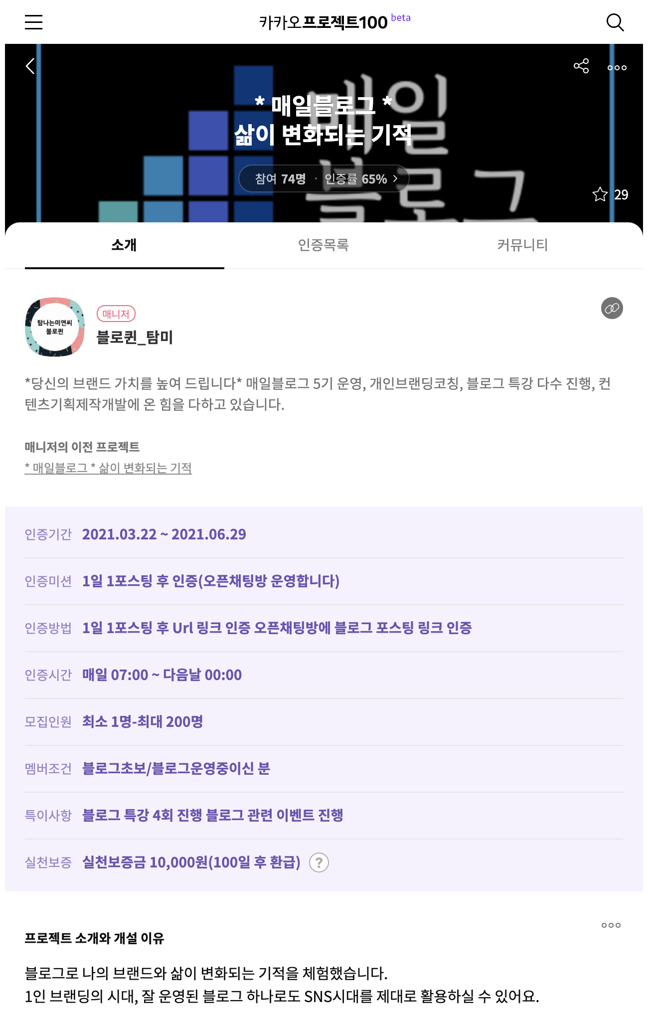 사실 블로그 포스팅하는 프로젝트가 몇 개 있었는데 이 프로젝트에 참여자가 많아서 참여하게 되었습니다. 매니저 분도 뭔가 전문가의 느낌이 납니다. 몰랐는데 특강도 진행을 한다고 하니 기대됩니다. 오픈 채팅방에도 들어가 보니 프로젝트 100 참여자가 아닌 다른 사람들도 많이 참여하고 있었고 오픈 채팅방에서도 활발히 인증을 올리고 상호작용하는 모습이 보였습니다. 참가한 지 하루밖에 안되었는데 끝나고도 꾸준히 참여해 보고 싶다는 생각이 들었습니다.