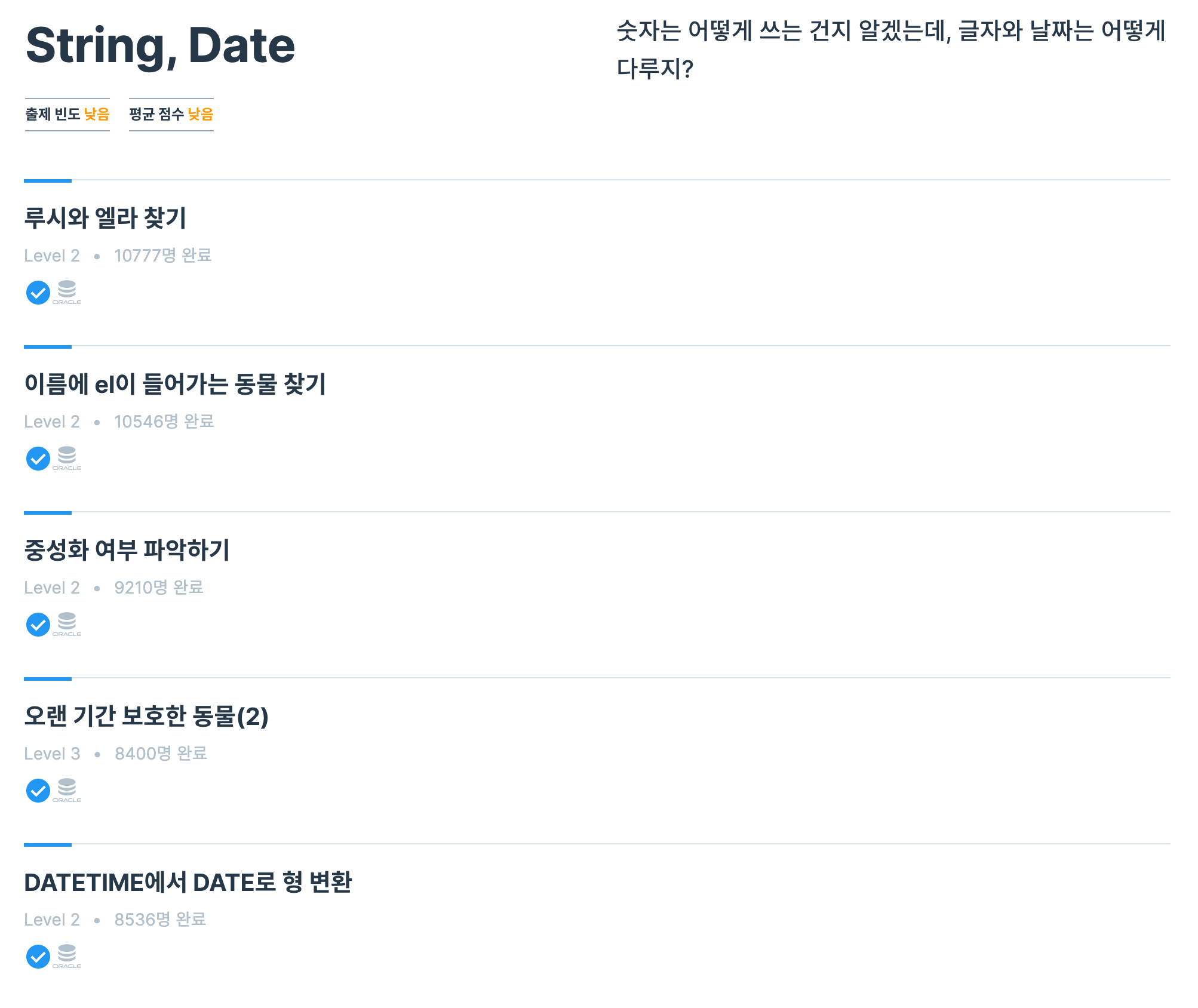 지난번엔 JOIN 문제들을 풀어 보았고 이번에는 String, Date 문제들을 풀어봅니다.