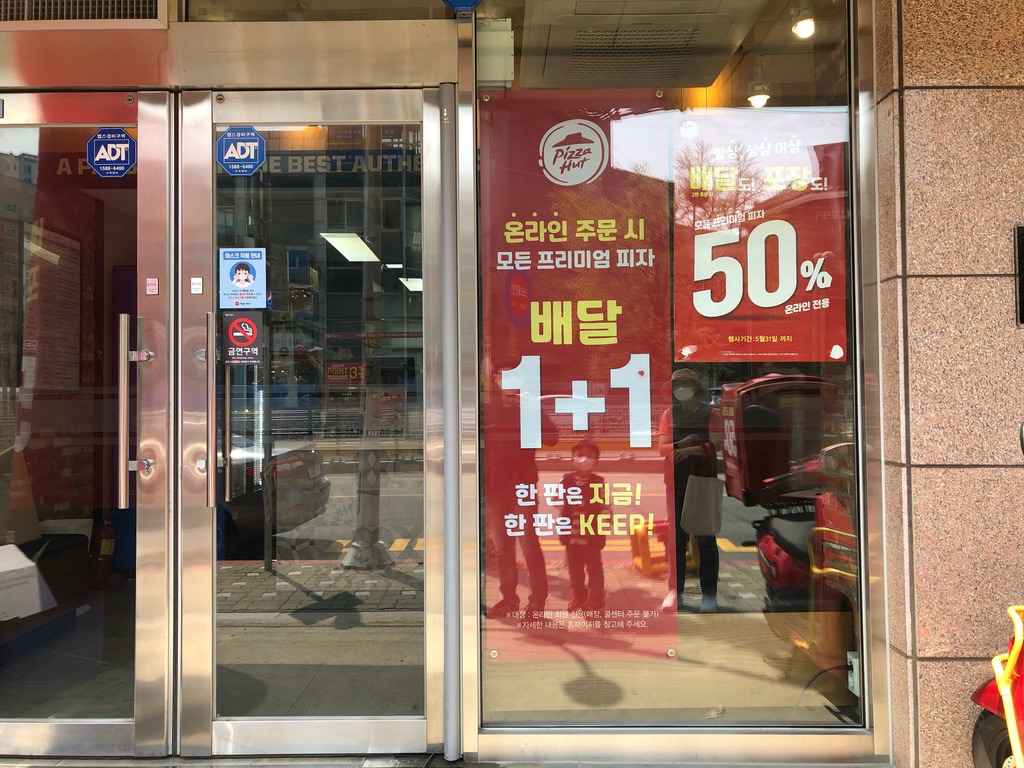 가게 밖에도 온라인 주문 시 50% 할인한다는 문구가 붙어있습니다.