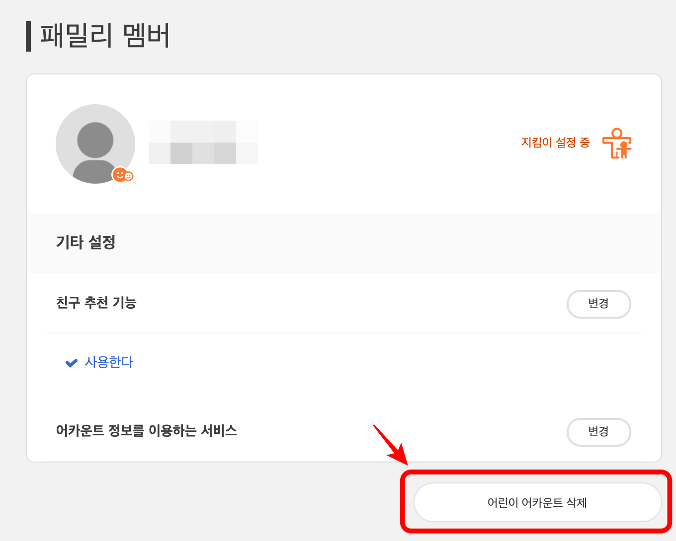 "기타 설정"으로 들어가면 "어린이 어카운트 삭제"를 할 수 있습니다.