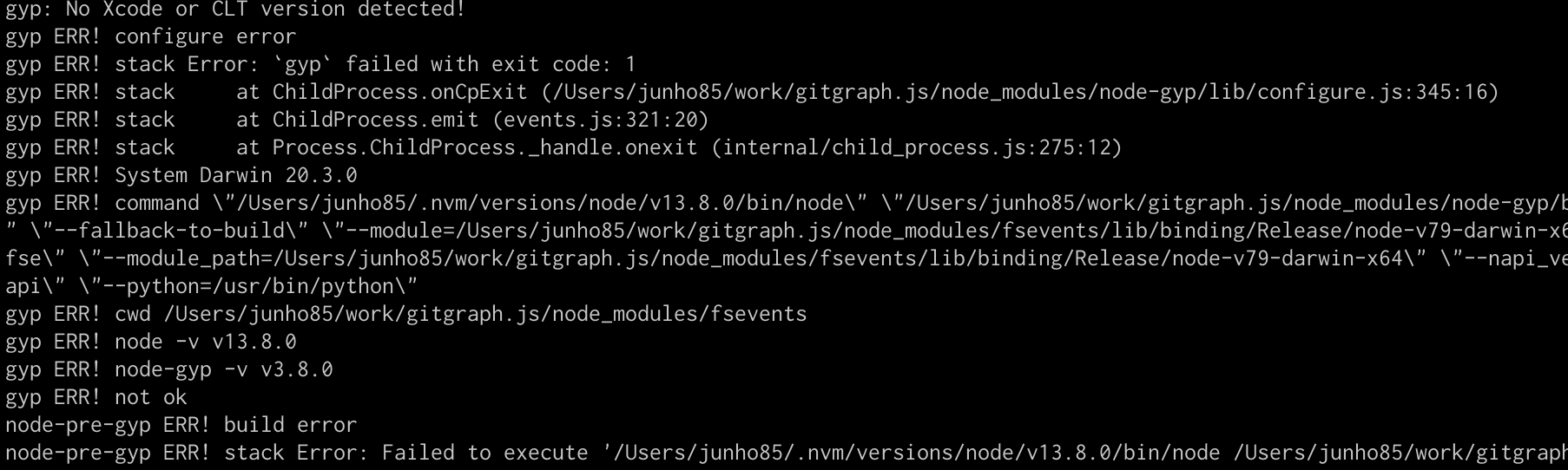 처음에는 lerna가 설치되어 있지 않다고 해서 lerna를 먼저 설치해 줬고 다시 해 보니 "gyp: No Xcode or CLT version detected!"오류가 발생했습니다.