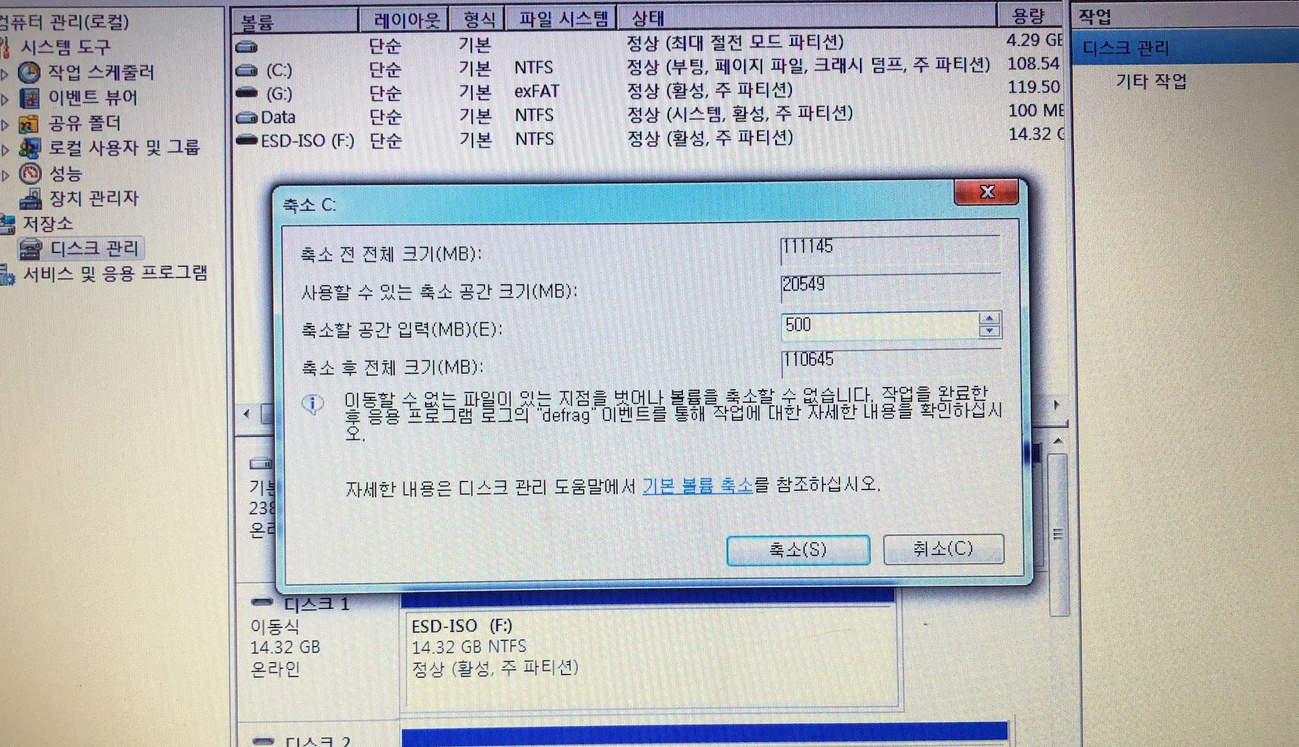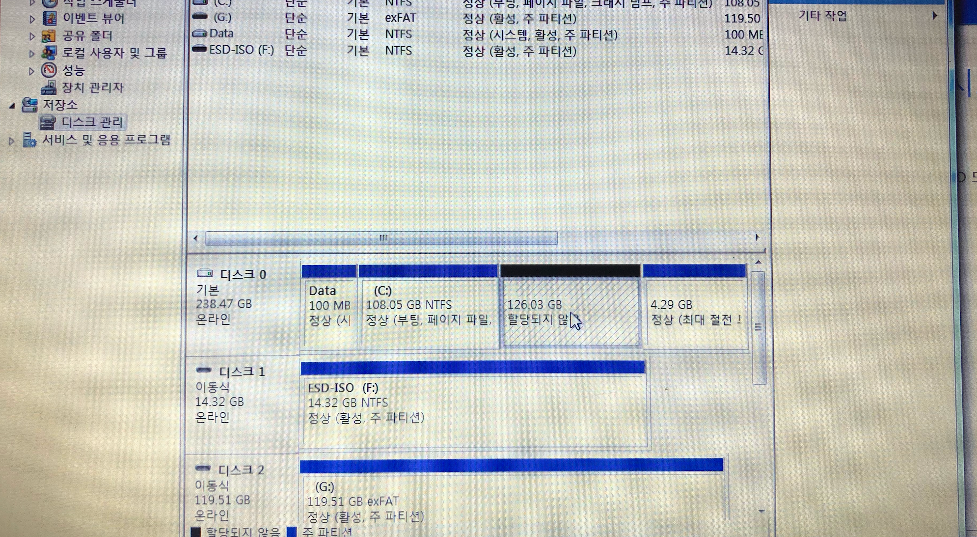 이미 파티션이 Data, C:, D:, 최대 절전 모드 데이터 보관 파티션으로 쪼개져 있다 보니 추가로 파티션이 생성이 잘 안되더군요.