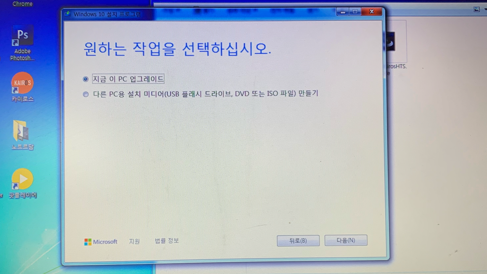 이번에는 USB 플래시 드라이브, ISO 파일을 이용한 USB 만들기 말고, "지금 이 PC 업그레이드"로 진행해 봅니다.